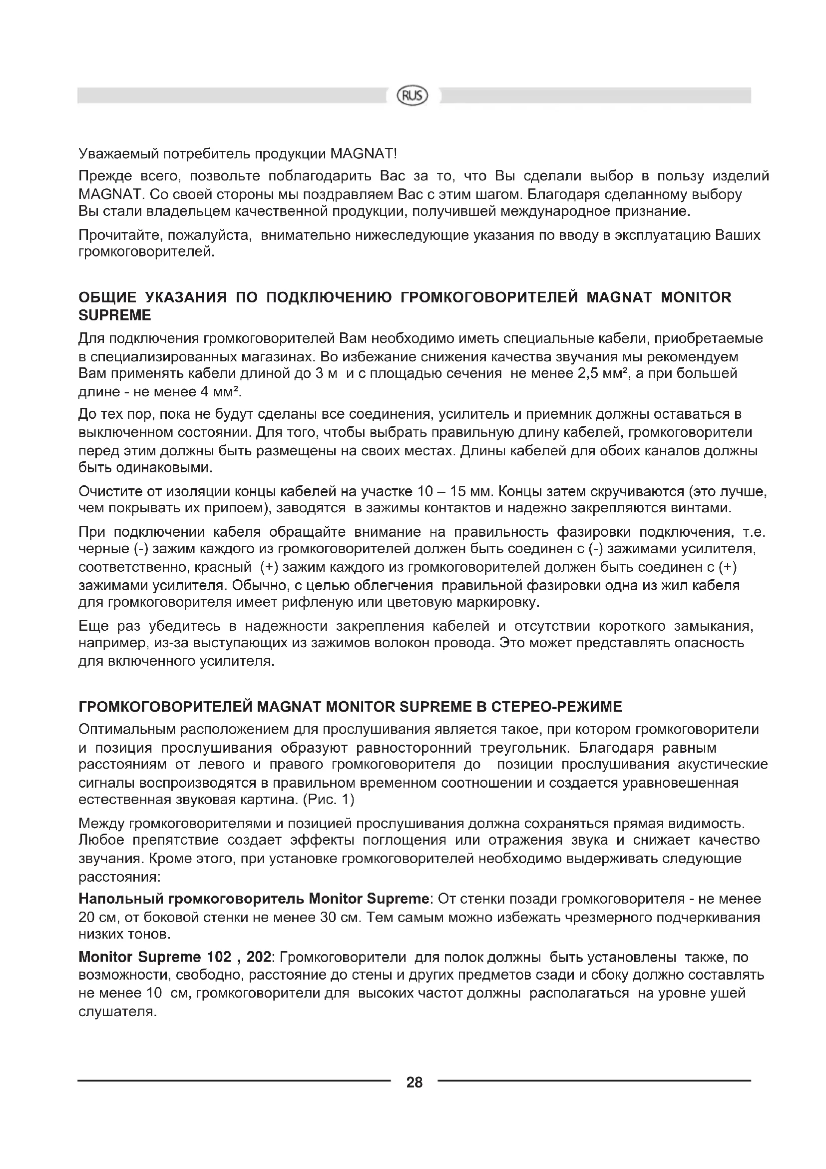 усилители, тюнеры и CD плееры - и не только в случае недорогих изделий - могут воспроизводить воспринимаемые слухом высокочастотные колебания. Если при малом и среднем уровнях громкости у Вас пропадают высокие тона, то Вашу систему должен проверить специалист. ТЕХНИЧЕСКИЕ ХАРАКТЕРИСТИКИ Monitor Supreme 2002 Monitor Supreme 1002 Конфигурация: 3 полосные “басрефлекс” 3 полосные “басрефлекс” Нагрузочная способность: 225 / 450 Вт 190 / 380 Вт Импеданц: 4 – 8 Ом 4 – 8 Ом Частотный диапазон: 18 – 40 000 Гц 19 – 40 000 Гц Рекомендуемая мощность усилителя: 30 – 450 Вт 30 – 380 Вт Коэф. полезного действия (1 Вт/1 м): 93 дБ 92 дБ Габариты (ШxВxГ): 267 x 1080 x 335 мм 215 x 950 x 313 мм Оснастка: Эбонитовые шипы Эбонитовые шипы Металлические шипы Металлические шипы Monitor Supreme 802 Monitor Supreme 202 Конфигурация: 2 ½ полосные “басрефлекс” 2 полосные “басрефлекс” Нагрузочная способность: 170 / 340 Вт 100 / 200 Вт Импеданц: 4 – 8 Ом 4 – 8 Ом Частотный диапазон: 22 – 40 000 Гц 34 – 40 000 Гц Рекомендуемая мощность усилителя: 30 – 340 Вт 30 – 200 Вт Коэф. полезного действия (1 Вт/1 м): 92 дБ 91 дБ Габариты (ШxВxГ): 215 x 850 x 273 мм 215 x 354 x 273 мм Оснастка: Эбонитовые шипы Эбонитовые шипы Металлические шипы Monitor Supreme 102 Monitor Supreme Center 252 Конфигурация: 2 полосные 2 полосные Нагрузочная способность: 60 / 120 Вт 75 / 150 Вт Импеданц: 4 – 8 Ом 4 – 8 Ом Частотный диапазон: 42 – 36 000 Гц 40 – 34 000 Гц Рекомендуемая мощность усилителя: 20 – 110 Вт 20 – 150 Вт Коэф. полезного действия (1 Вт/1 м): 89 дБ 90 дБ Габариты (ШxВxГ): 149 x 250 x 190 мм 420 x 145 x 190 мм Оснастка: Эбонитовые шипы Эбонитовые шипы ВОЗМОЖНЫ ТЕХНИЧЕСКИЕ ИЗМЕНЕНИЯ31 尊敬的 MAGNAT用户, 首先诚挚感谢您选购了 MAGNAT产品。我方在此向您表示衷心的祝贺。 您选择明智, 现在 拥 有了一件举世皆认之精品。 在使用您的音箱之前,请您先认真阅读下列各项说明。