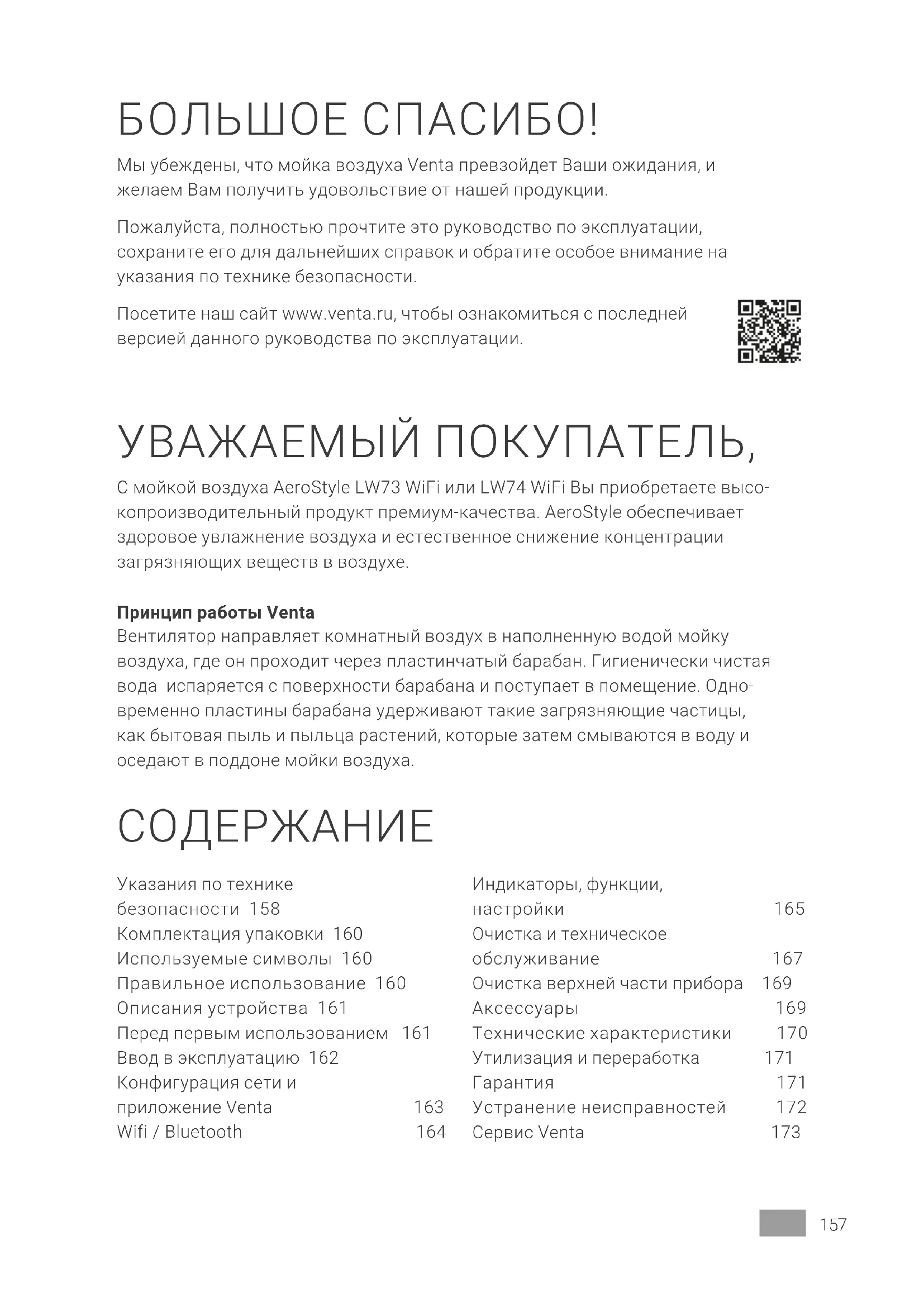 Указания по технике безопасности 158 Комплектация упаковки 160 Используемые символы 160 Правильное использование 160 Описания устройства 161 Перед первым использованием 161 Ввод в эксплуатацию 162 Конфигурация сети и приложение Venta 163 Wifi / Bluetooth 164 Индикаторы, функции, настройки 165 Очистка и техническое обслуживание 167 Очистка верхней части прибора 169 Аксессуары 169 Технические характеристики 170 Утилизация и переработка 171 Гарантия 171 Устранение неисправностей 172 Сервис Venta 173158 RU
