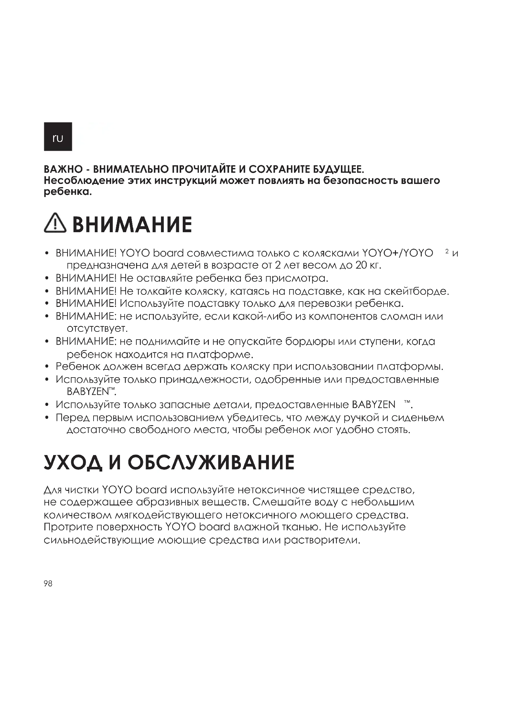 - Перед первым использованием убедитесь, что между ручкой и сиденьем достаточно свободного места, чтобы ребенок мог удобно стоять. УХОД И ОБСЛУЖИВАНИЕ Для чистки YOYOboard используйте нетоксичное чистящее средство, не содержащее абразивных веществ. Смешайте воду с небольшим количеством мягкодействующего нетоксичного моющего средства. Протрите поверхность YOYOboard влажной тканью. Не используйте сильнодействующие моющие средства или растворители. 98ru ГАРАНТИЯ И ПОСЛЕПРОДАЖНОЕ ОБСЛУЖИВАНИЕ Изготовитель колясок, торговая марка BABYZEN