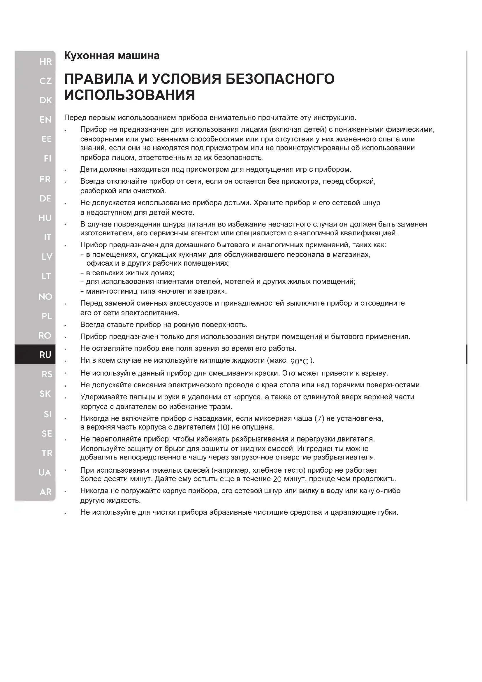 ARПРАВИЛА И УСЛОВИЯ БЕЗОПАСНОГО ИСПОЛЬЗОВАНИЯ Перед первым использованием прибора внимательно прочитайте эту инструкцию. Прибор не предназначен для использования лицами (включая детей) с пониженными физическими, сенсорными или умственными способностями или при отсутствии у них жизненного опыта или знаний, если они не находятся под присмотром или не проинструктированы об использовании прибора лицом, ответственным за их безопасность. Дети должны находиться под присмотром для недопущения игр с прибором. Всегда отключайте прибор от сети, если он остается без присмотра, перед сборкой, разборкой или очисткой. Не допускается использование прибора детьми. Храните прибор и его сетевой шнур в недоступном для детей месте. В случае повреждения шнура питания во избежание несчастного случая он должен быть заменен изготовителем, его сервисным агентом или специалистом с аналогичной квалификацией. Прибор предназначен для домашнего бытового и аналогичных применений, таких как: – в помещениях, служащих кухнями для обслуживающего персонала в магазинах, офисах и в других рабочих помещениях; – в сельских жилых домах; – для использования клиентами отелей, мотелей и других жилых помещений; – мини-гостиниц типа «ночлег и завтрак». Перед заменой сменных аксессуаров и принадлежностей выключите прибор и отсоедините его от сети электропитания. Всегда ставьте прибор на ровную поверхность. Прибор предназначен только для использования внутри помещений и бытового применения. Не оставляйте прибор вне поля зрения во время его работы. Ни в коем случае не используйте кипящие жидкости (макс. 90°C