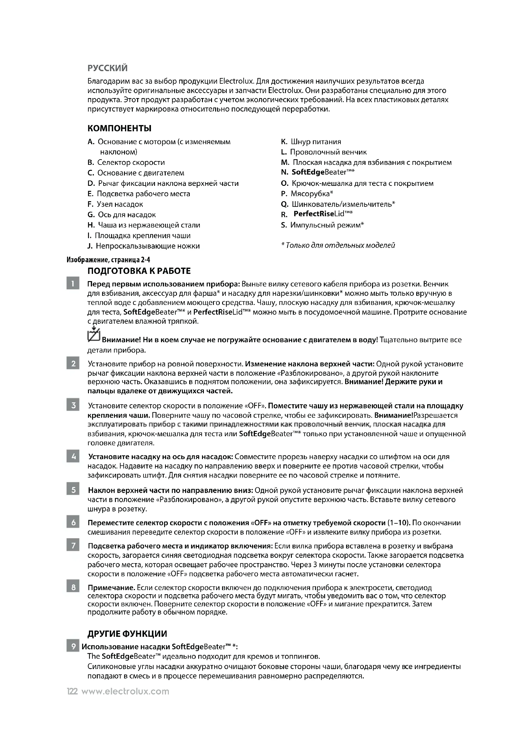 - Только для отдельных моделей Изображение, страница 2-4 ПОДГОТОВКА К РАБОТЕ 1 Перед первым использованием прибора: Выньте вилку сетевого кабеля прибора из розетки. Венчик для взбивания, аксессуар для фарша* и насадку для нарезки/шинковки* можно мыть только вручную в теплой воде с добавлением моющего средства. Чашу, плоскую насадку для взбивания, крючок-мешалку для теста, SoftEdgeBeater™* и PerfectRiseLid™* можно мыть в посудомоечной машине. Протрите основание с двигателем влажной тряпкой. Внимание! Ни в коем случае не погружайте основание с двигателем в воду! Тщательно вытрите все детали прибора. 2 Установите прибор на ровной поверхности. Изменение наклона верхней части: Одной рукой установите рычаг фиксации наклона верхней части в положение «Разблокировано», а другой рукой наклоните верхнюю часть. Оказавшись в поднятом положении, она зафиксируется. Внимание! Держите руки и пальцы вдалеке от движущихся частей. 3 Установите селектор скорости в положение «OFF». Поместите чашу из нержавеющей стали на площадку крепления чаши. Поверните чашу по часовой стрелке, чтобы ее зафиксировать. Внимание!Разрешается взбивания, крючок-мешалка для теста или SoftEdgeBeater™* только при установленной чаше и опущенной головке двигателя. 4 Установите насадку на ось для насадок: Совместите прорезь наверху насадки со штифтом на оси для насадок. Надавите на насадку по направлению вверх и поверните ее против часовой стрелки, чтобы зафиксировать штифт. Для снятия насадки поверните ее по часовой стрелке и потяните. 5 Наклон верхней части по направлению вниз: Одной рукой установите рычаг фиксации наклона верхней части в положение «Разблокировано», а другой рукой опустите верхнюю часть. Вставьте вилку сетевого шнура в розетку. 6 Переместите селектор скорости с положения «OFF» на отметку требуемой скорости (1–10). По окончании смешивания переведите селектор скорости в положение «OFF» и извлеките вилку прибора из розетки. 7 Подсветка рабочего места и индикатор включения: Если вилка прибора вставлена в розетку и выбрана скорость, загорается синяя светодиодная подсветка вокруг селектора скорости. Также загорается подсветка рабочего места, которая освещает рабочее пространство. Через 3 минуты после установки селектора скорости в положение «OFF» подсветка рабочего места автоматически гаснет. 8 Примечание. Если селектор скорости включен до подключения прибора к электросети, светодиод селектора скорости и подсветка рабочего места будут мигать, чтобы уведомить вас о том, что селектор скорости включен. Поверните селектор скорости в положение «OFF» и мигание прекратится. Затем продолжите работу в обычном порядке. ДРУГИЕ ФУНКЦИИ 9 Использование насадки SoftEdgeBeater™ *: The SoftEdgeBeater™ идеально подходит для кремов и топпингов. Силиконовые углы насадки аккуратно очищают боковые стороны чаши, благодаря чему в се ингредиенты попадают в смесь и в процессе перемешивания равномерно распределяются.123www.electrolux.com