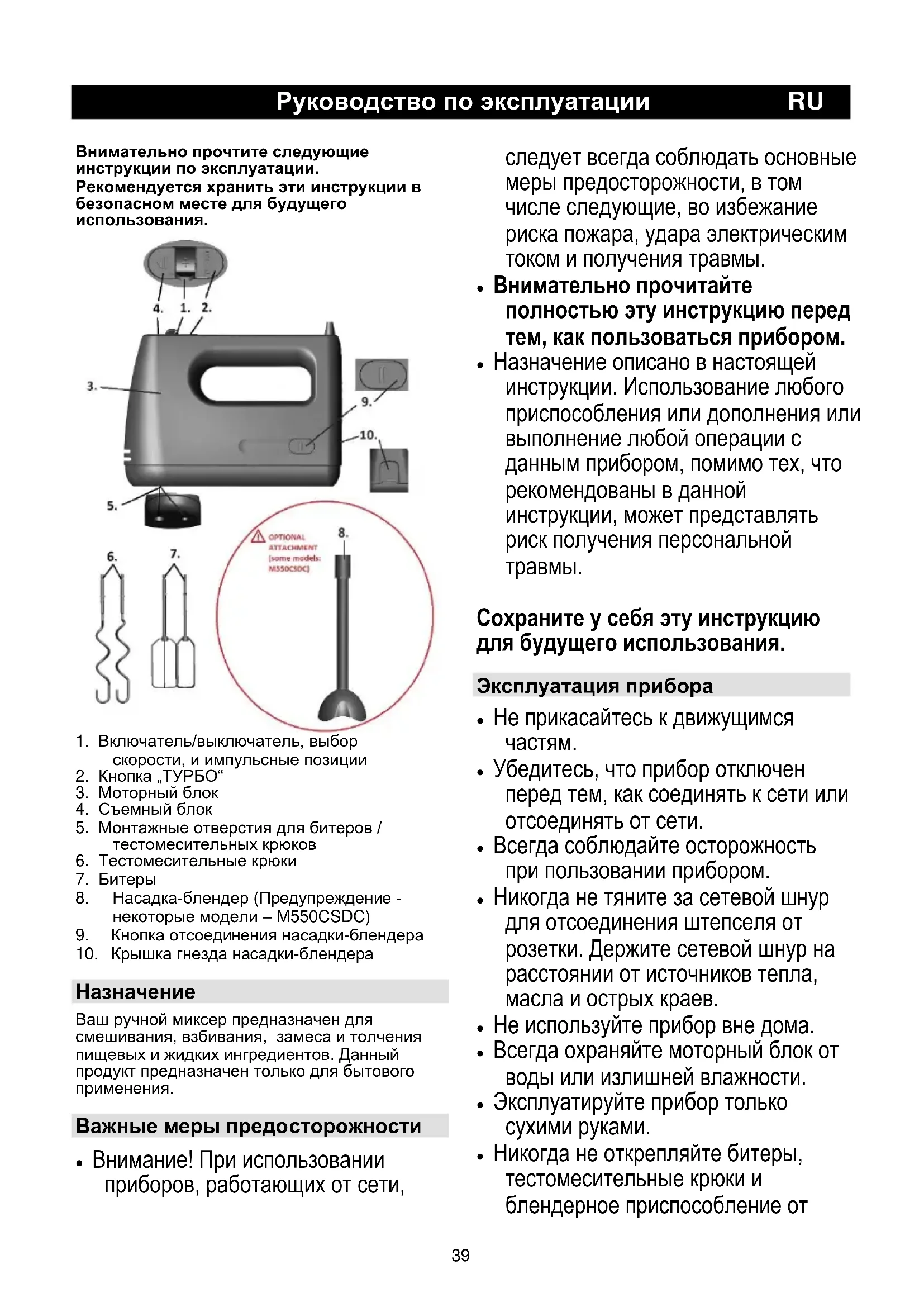 Ваш ручной миксер предназначен для смешивания, взбивания, замеса и толчения пищевых и жидких ингредиентов. Данный продукт предназначен только для бытового применения. Важные меры предосторожности