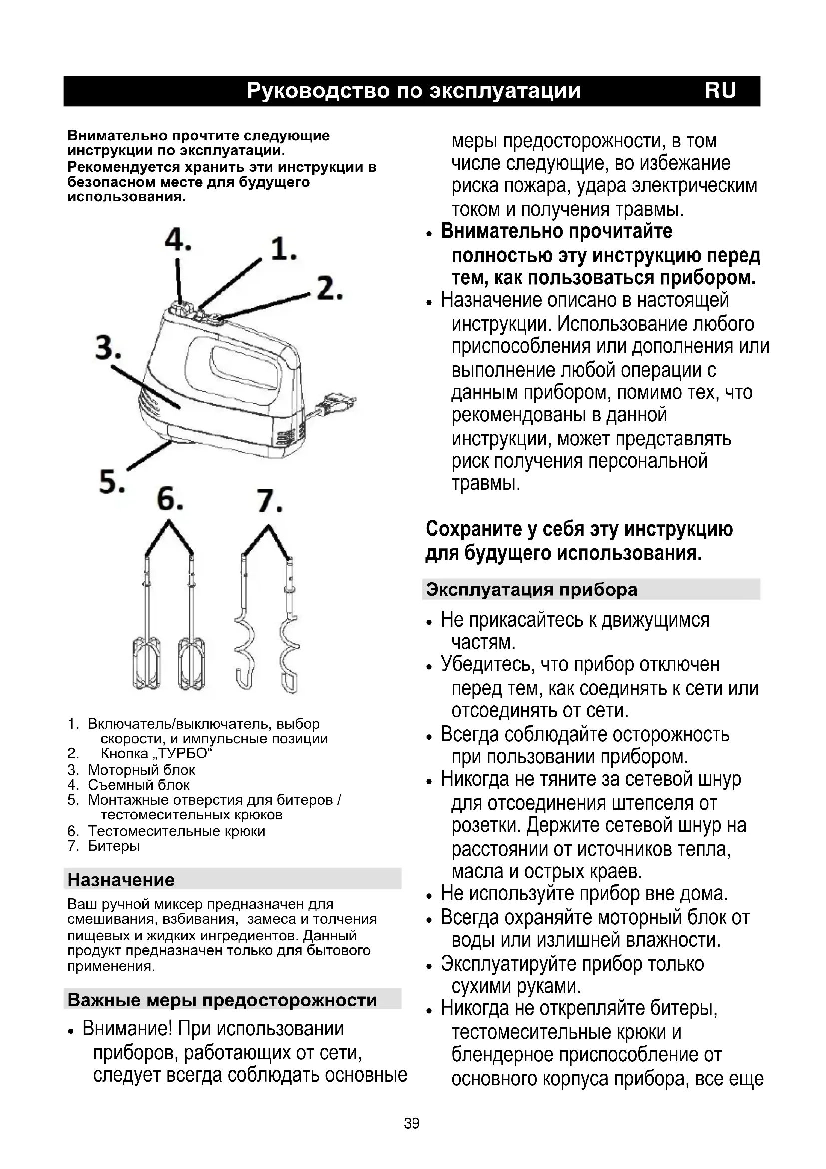 - Никогда не открепляйте битеры, тестомесительные крюки и блендерное приспособление от основного корпуса прибора, все еще40 включенного в сеть. Всегда сначала отключайте прибор от сети.