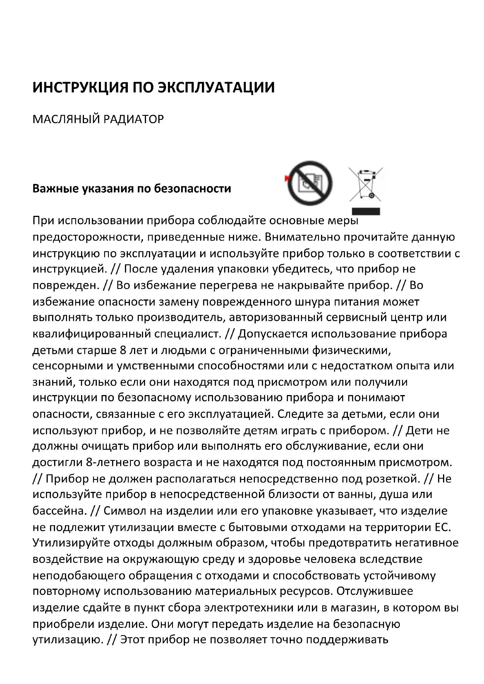 RENJE ВИ ПОЖЕЛАВА ПРИЯТНО ПОЛЗВАНЕ НА ВАШИЯ РАДИАТОР!ИНСТРУКЦИЯ ПО ЭКСПЛУАТАЦИИ МАСЛЯНЫЙ РАДИАТОР Важные указания по безопасности При использовании прибора соблюдайте основные меры предосторожности, приведенные ниже. Внимательно прочитайте данную инструкцию по эксплуатации и используйте прибор только в соответствии с инструкцией. // После удаления упаковки убедитесь, что прибор не поврежден. // Во избежание перегрева не накрывайте прибор. // Во избежание опасности замену поврежденного шнура питания может выполнять только производитель, авторизованный сервисный центр или квалифицированный специалист. // Допускается использование прибора детьми старше 8 лет и людьми с ограниченными физическими, сенсорными и умственными способностями или с недостатком опыта или знаний, только если они находятся под присмотром или получили инструкции по безопасному использованию прибора и понимают опасности, связанные с его эксплуатацией. Следите за детьми, если они используют прибор, и не позволяйте детям играть с прибором. // Дети не должны очищать прибор или выполнять его обслуживание, если они достигли 8-летнего возраста и не находятся под постоянным присмотром. // Прибор не должен располагаться непосредственно под розеткой. // Не используйте прибор в непосредственной близости от ванны, душа или бассейна. // Символ на изделии или его упаковке указывает, что изделие не подлежит утилизации вместе с бытовыми отходами на территории ЕС. Утилизируйте отходы должным образом, чтобы предотвратить негативное воздействие на окружающую среду и здоровье человека вследствие неподобающего обращения с отходами и способствовать устойчивому повторному использованию материальных ресурсов. Отслужившее изделие сдайте в пункт сбора электротехники или в магазин, в котором вы приобрели изделие. Они могут передать изделие на безопасную утилизацию. // Этот прибор не позволяет точно поддерживатьтемпературу в помещении, поэтому не может использоваться в качестве изоляционного устройства для помещений хранения, предметов, животных и растений. // Этот прибор заполнен определенным количеством специального масла. Ремонтные работы, требующие открытия емкости с маслом, может выполнять только производитель или его сервисная служба. При утилизации прибора необходимо соблюдать местные правила утилизации отработанного масла. // 10. Этот прибор не позволяет точно поддерживать температуру в помещении, поэтому не может использоваться в качестве изоляционного устройства для помещений хранения, предметов, животных и растений. // Прибор предназначен только для использования в домашнем хозяйстве.
