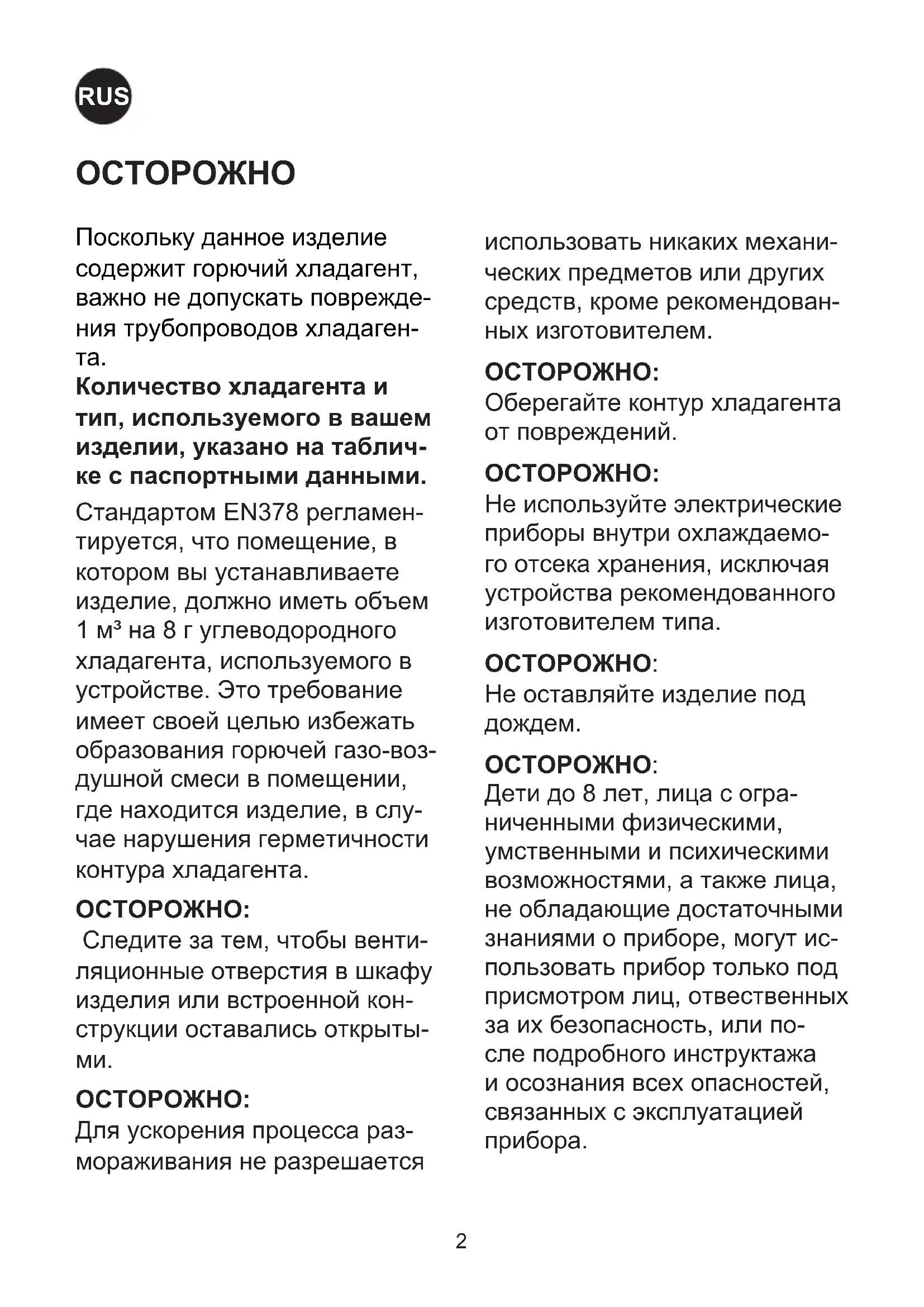 В устройстве используется воспламеняющийся газ для изоляции.За информацией о безопасной утилизации об- ращайтесь в местную службу утилизации. См. Раздел Утилизация ● Храните ключи в отдельном месте, недоступном для детей ● Прежде чем приступать к техни- ческому обслуживанию или мойке изделия, отключите источник электропитания ● В случае повреждения шнура пи- тания изготовитель, его сервисный агент или иные квалифицирован- ные лица должны заменить его во избежание опасности