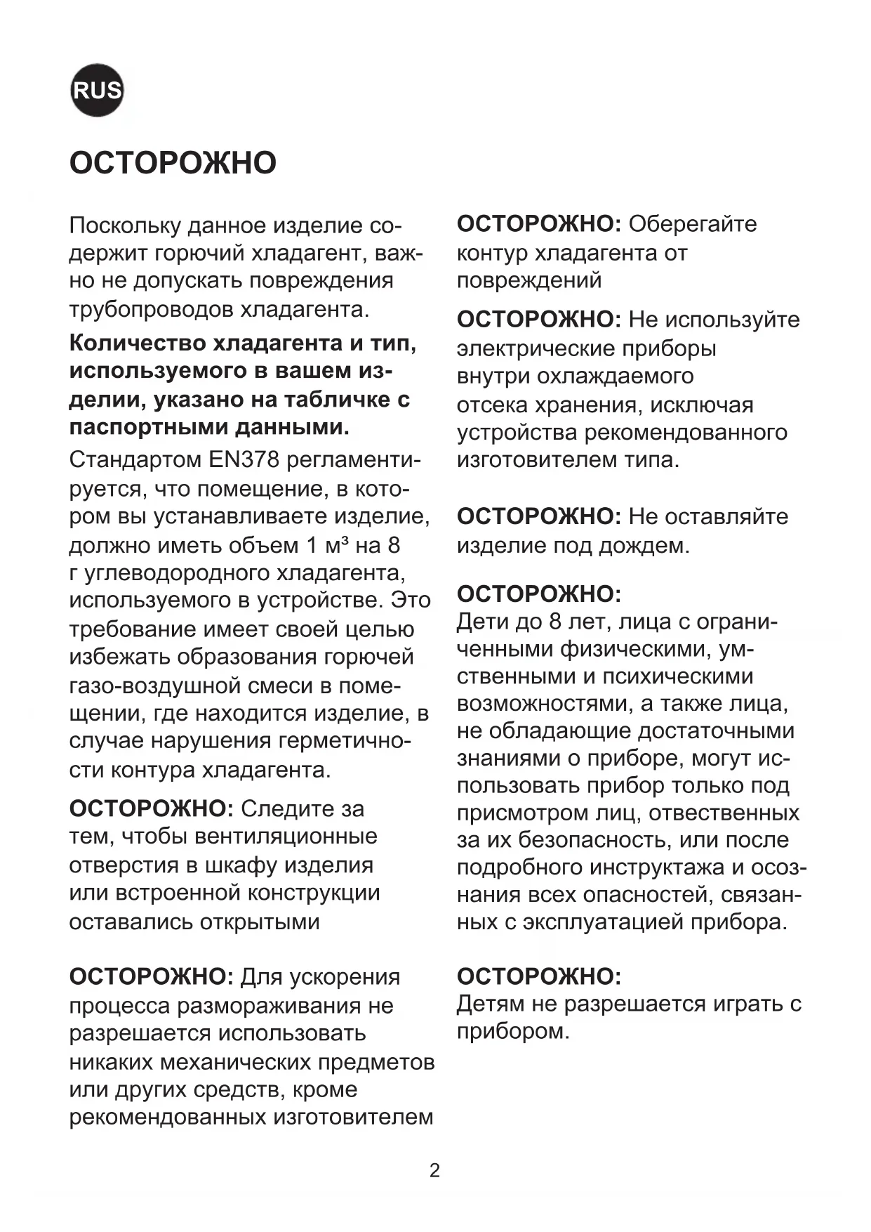 Очистка и обслуживание при- бора не должны производиться детьми, это допустимо, только если они старше 8 лет и их кон- тролируют взрослые. ОСТОРОЖНО:Оберегайте контур хладагента от повреждений. ОСТОРОЖНО:Не храните взрывоопасные вещества, такие как аэрозольные баллоны с горючей топлива в этом