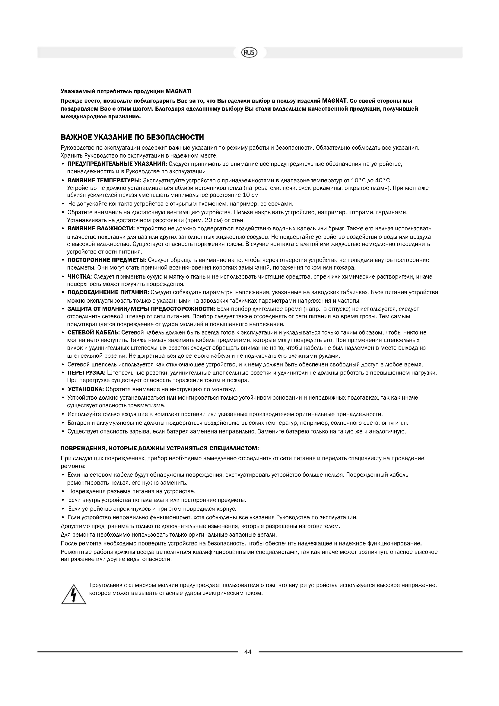 - Если устройство неправильно функционирует, хотя соблюдены все указания Руководства по эксплуатации. Допустимо предпринимать только те дополнительные изменения, которые разрешены изготовителем. Для ремонта необходимо использовать только оригинальные запасные детали. После ремонта необходимо проверить устройство на безопасность, чтобы обеспечить надлежащее и надежное функционирование. Ремонтные работы должны всегда выполняться квалифицированными специалистами, так как иначе может возникнуть опасное высокое напряжение или другие виды опасности. Треугольник с символом молнии предупреждает пользователя о том, что внутри устройства используется высокое напряжение, которое может вызывать опасные удары электрическим током.45 Треугольник с восклицательным знаком обращает внимание пользователя на то, что в прилагаемом Руководстве по эксплуатации содержатся важные указания по эксплуатации и техническому обслуживанию (ремонту), которые должны обязательно соблюдаться.