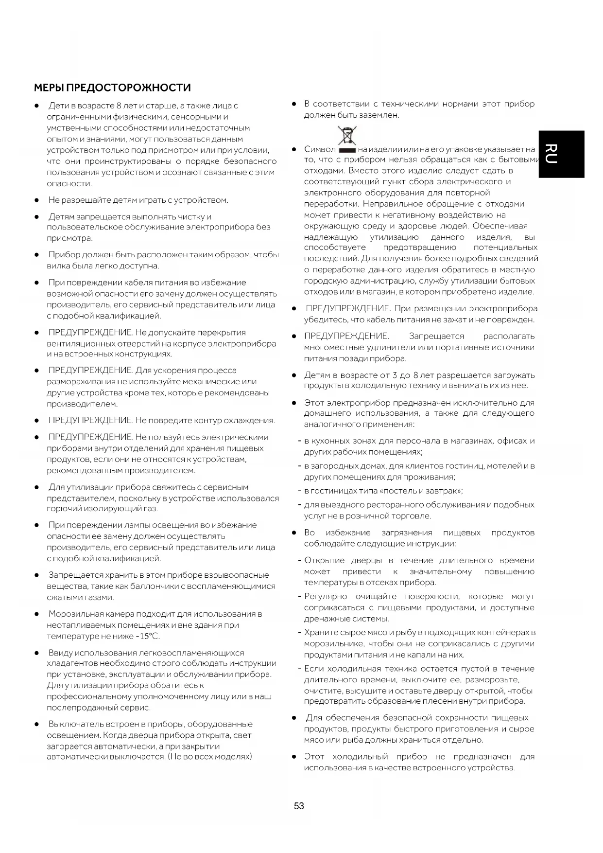 ● Прибор должен быть расположен таким образом, чтобы вилка была легко доступна. ● При повреждении кабеля питания во избежание возможной опасности его замену должен осуществлять производитель, его сервисный представитель или лица с подобной квалификацией. ● ПРЕДУПРЕЖДЕНИЕ. Не допускайте перекрытия вентиляционных отверстий на корпусе электроприбора и на встроенных конструкциях. ● ПРЕДУПРЕЖДЕНИЕ. Для ускорения процесса размораживания не используйте механические или другие устройства кроме тех, которые рекомендованы производителем. ● ПРЕДУПРЕЖДЕНИЕ. Не повредите контур охлаждения. ● ПРЕДУПРЕЖДЕНИЕ. Не пользуйтесь электрическими приборами внутри отделений для хранения пищевых продуктов, если они не относятся к устройствам, рекомендованным производителем. ● Для утилизации прибора свяжитесь с сервисным представителем, поскольку в устройстве использовался горючий изолирующий газ. ● При повреждении лампы освещения во избежание опасности ее замену должен осуществлять производитель, его сервисный представитель или лица с подобной квалификацией. ● Запрещается хранить в этом приборе взрывоопасные вещества, такие как баллончики с воспламеняющимися сжатыми газами. ● Морозильная камера подходит для использования в неотапливаемых помещениях и вне здания при температуре не ниже -15°C. ● Ввиду использования легковоспламеняющихся хладагентов необходимо строго соблюдать инструкции при установке, эксплуатации и обслуживании прибора. Для утилизации прибора обратитесь к профессиональному уполномоченному лицу или в наш послепродажный сервис. ● Выключатель встроен в приборы, оборудованные освещением. Когда дверца прибора открыта, свет загорается автоматически, а при закрытии автоматически выключается. (Не во всех моделях) ● В соответствии с техническими нормами этот прибор должен быть заземлен. ● Символ на изделии или на его упаковке указывает на то, что с прибором нельзя обращаться как с бытовыми отходами. Вместо этого изделие следует сдать в соответствующий пункт сбора электрического и электронного оборудования для повторной переработки. Неправильное обращение с отходами может привести к негативному воздействию на окружающую среду и здоровье людей. Обеспечивая надлежащую утилизацию данного изделия, вы способствуете предотвращению потенциальных последствий. Для получения более подробных сведений о переработке данного изделия обратитесь в местную городскую администрацию, службу утилизации бытовых отходов или в магазин, в котором приобретено изделие. ● ПРЕДУПРЕЖДЕНИЕ. При размещении электроприбора убедитесь, что кабель питания не зажат и не поврежден. ● ПРЕДУПРЕЖДЕНИЕ. Запрещается располагать многоместные удлинители или портативные источники питания позади прибора. ● Детям в возрасте от 3 до 8 лет разрешается загружать продукты в холодильную технику и вынимать их из нее. ● Этот электроприбор предназначен исключительно для домашнего использования, а также для следующего аналогичного применения: - в кухонных зонах для персонала в магазинах, офисах и других рабочих помещениях; - в загородных домах, для клиентов гостиниц, мотелей и в других помещениях для проживания; - в гостиницах типа «постель и завтрак»; - для выездного ресторанного обслуживания и подобных услуг не в розничной торговле. ● Во избежани