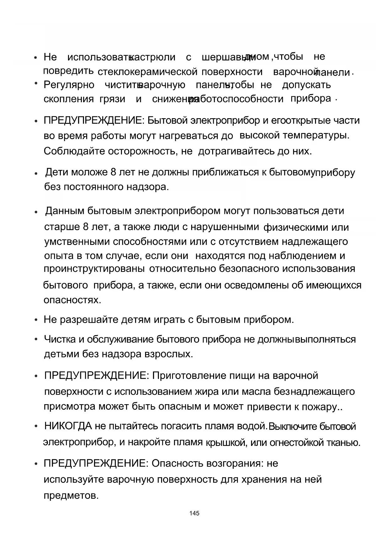 RUSSIANПРЕДУПРЕЖДЕНИЕ: Бытовой электроприбор и его дотрагивайтесь до них. Дети моложе 8 лет не должны приближаться к бытовому Данным бытовым электроприбором могут пользоваться прибора, а также, если они осведомлены об имеющихся опасностях. Не разрешайте детям играть с бытовым прибором. Чистка и обслуживание бытового прибора не должны ПРЕДУПРЕЖДЕНИЕ: Приготовление пищи на варочной поверхности с использованием жира или масла без Ɋɟɝɭɥɹɪɧɨ ɱɢɫɬɢɬɶ ɜɚɪɨɱɧɭɸ ɩɚɧɟɥɶ,