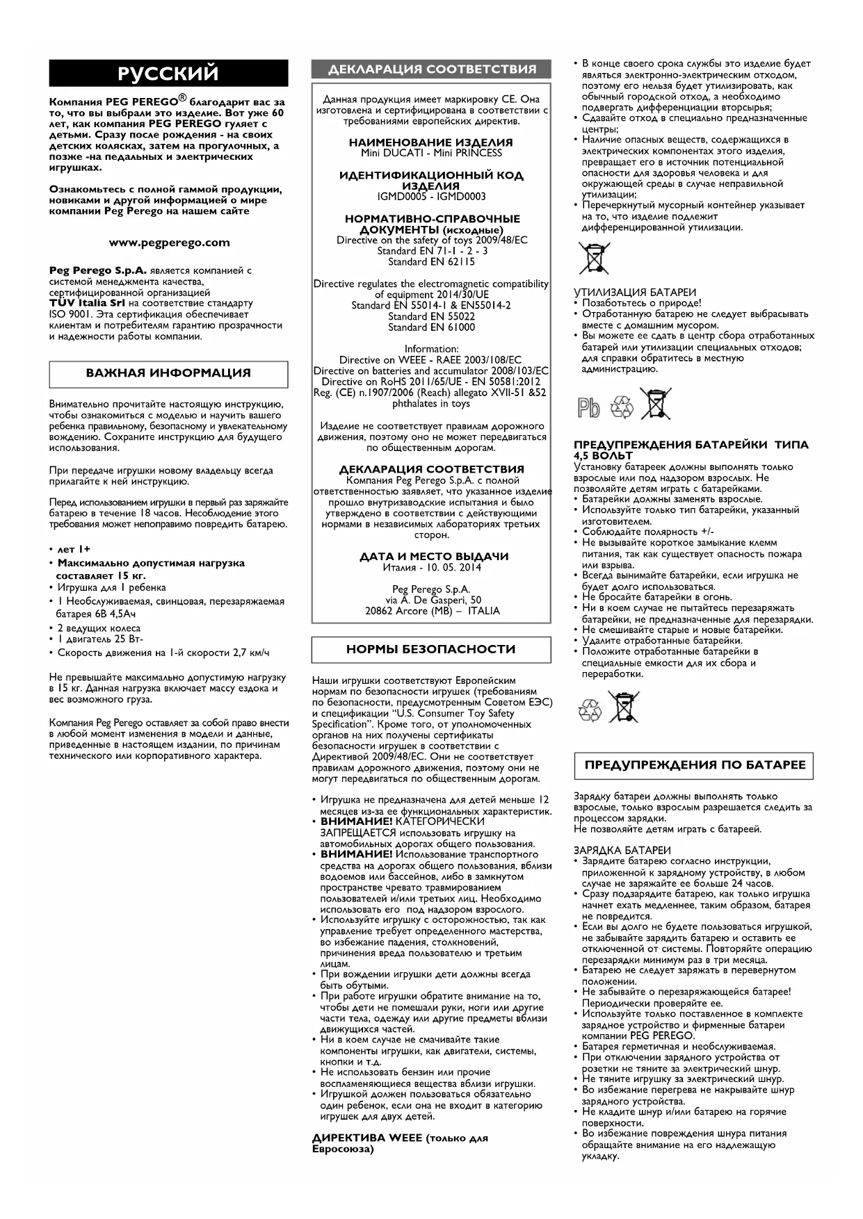 НОРМАТИВНО-СПРАВОЧНЫЕ ДОКУМЕНТЫ (исходные) Directive on the safety of toys 2009/48/EC Standard EN 71-1 - 2 - 3 Standard EN 62115 Directive regulates the electromagnetic compatibility of equipment 2014/30/UE Standard EN 55014-1 & EN55014-2 Standard EN 55022 Standard EN 61000 Information: Directive on WEEE - RAEE 2003/108/EC Directive on batteries and accumulator 2008/103/EC Directive on RoHS 2011/65/UE - EN 50581:2012 Reg. (CE) n.1907/2006 (Reach) allegato XVII-51 &52 phthalates in toys Изделие не соответствует правилам дорожного движения, поэтому оно не может передвигаться по общественным дорогам. ДЕКЛАРАЦИЯ СООТВЕТСТВИЯ Компания Peg Perego S.p.A. с полной ответственностью заявляет, что указанное изделие прошло внутризаводские испытания и было утверждено в соответствии с действующими нормами в независимых лабораториях третьих