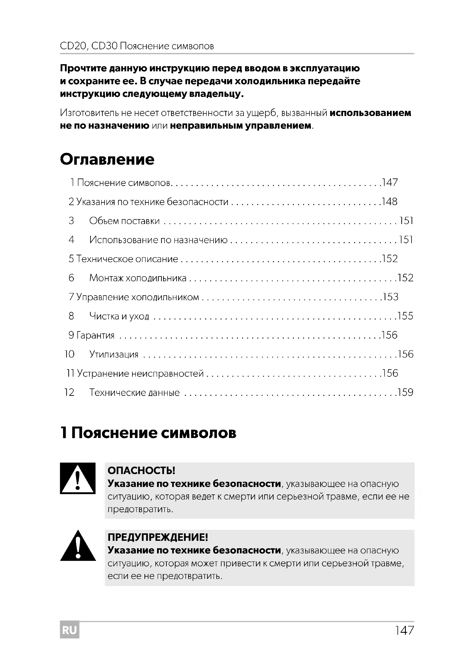 Храните сырое мясо и рыбу в устройстве в подходящих контейне- рах, чтобы они не соприкасались с другими продуктами питания или не капали на них. CD20-30-IO-16s.book Seite 149 Montag, 18. Mai 2020 2:25 14RU Указания по технике безопасности CD20, CD30