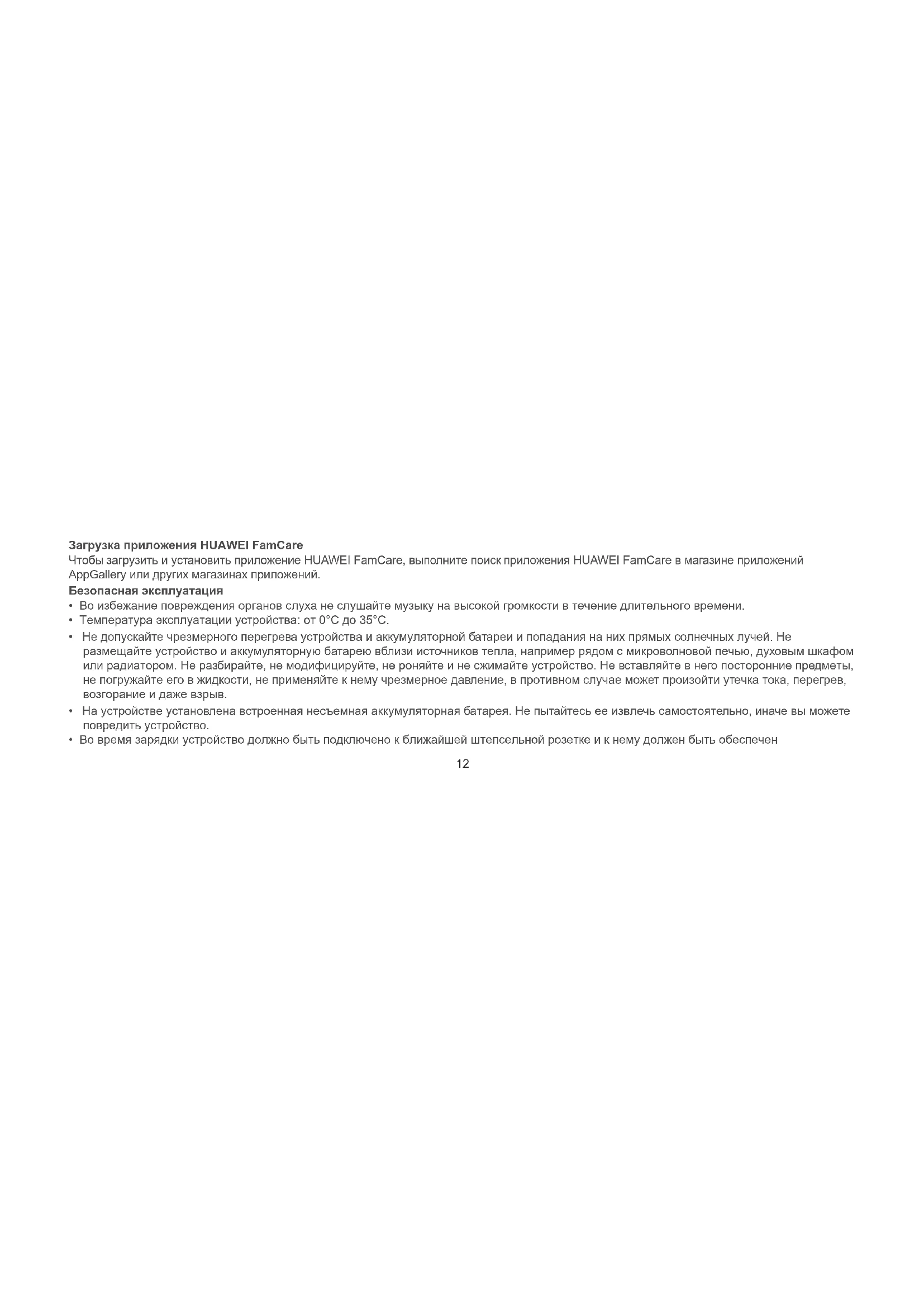 Перед использованием устройства посетите веб-сайт https://consumer.huawei.com/ru/support/. в поисковой строке введите название устройства и загрузите для него последнюю версию документа Краткое руководство пользователя.12 Загрузка приложения HUAWEI FamCare Чтобы загрузить и установить приложение HUAWEI FamCare, выполните поиск приложения HUAWEI FamCare в магазине приложений AppGallery или других магазинах приложений. Безопасная эксплуатация
