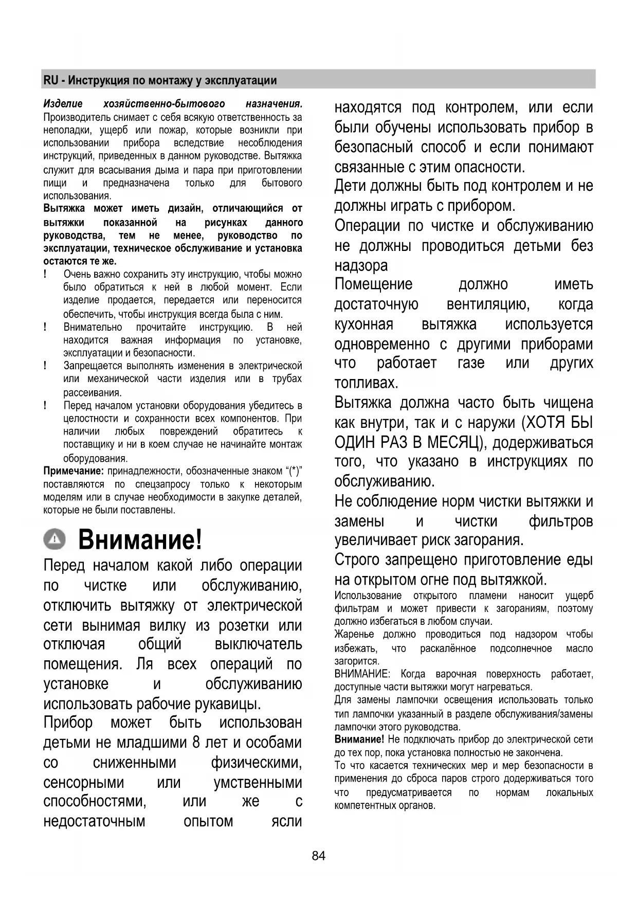 Перед началом какой либо операции по чистке или обслуживанию, отключить вытяжку от электрической сети вынимая вилку из розетки или отключая общий выключатель помещения. Ля всех операций по установке и обслуживанию использовать рабочие рукавицы. Прибор может быть использован детьми не младшими 8 лет и особами со сниженными физическими, сенсорными или умственными способностями, или же с недостаточным опытом ясли находятся под контролем, или если были обучены использовать прибор в безопасный способ и если понимают связанные с этим опасности. Дети должны быть под контролем и не должны играть с прибором. Операции по чистке и обслуживанию не должны проводиться детьми без