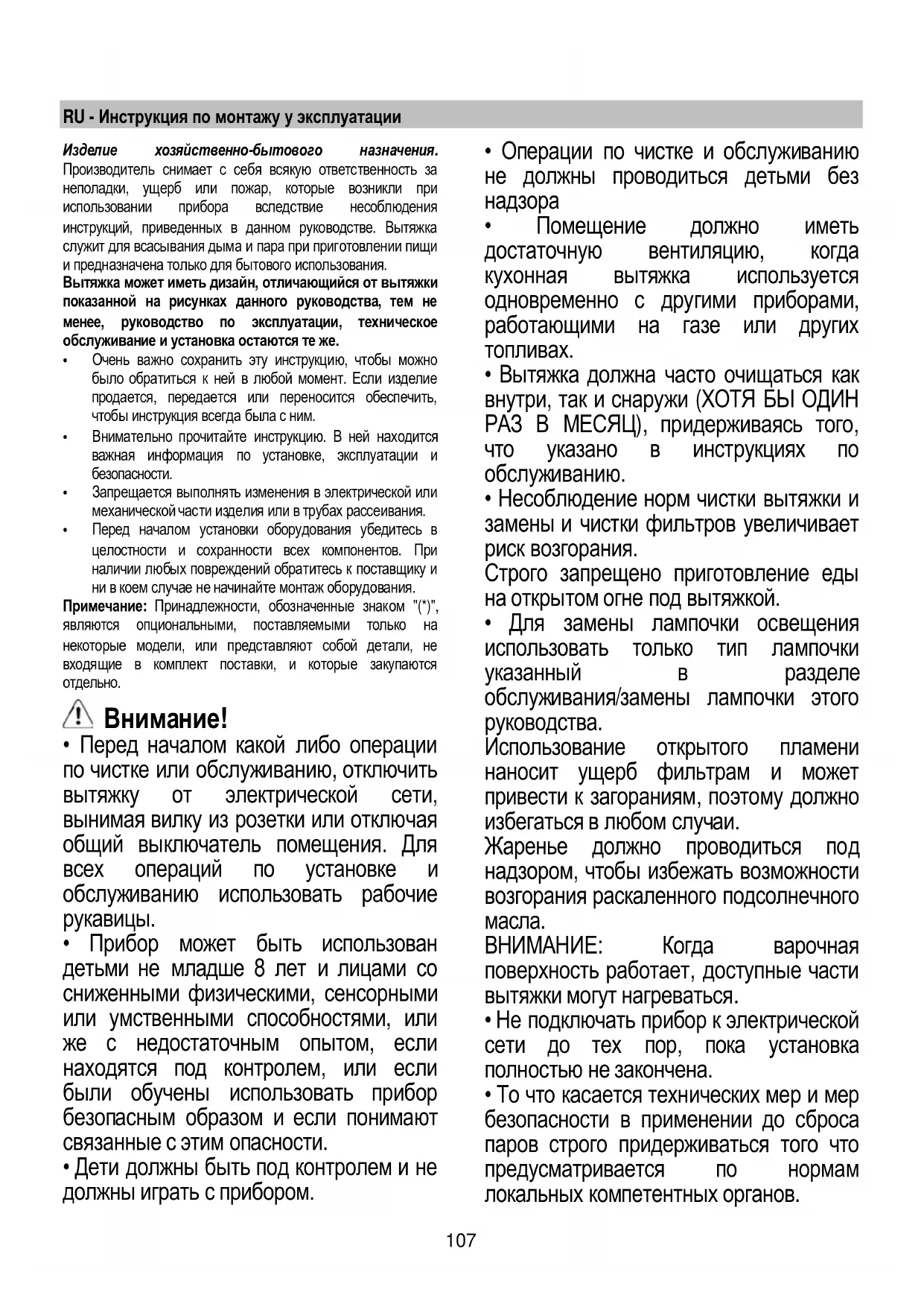 - Pentru demontarea filtrului procedaţi în sens invers. Înlocuirea becurilor Hota este dotată cu un sistem de iluminare bazat pe tehnologia LED. LEDURILE garantează o iluminare optimă, o durată de până la 10 ori mai mare faţă de becurile tradiţionale şi permit economisirea a 90% de energia electrică. Sistemul de iluminat nu poate fi schimbat de către utilizator. În caz de probleme de funcționare, adresați-vă departamentului de asistență.107 RU - Инструкция по монтажу у эксплуатации Изделие хозяйственно-бытового назначения. Производитель снимает с себя всякую ответственность за неполадки, ущерб или пожар, которые возникли при использовании прибора вследствие несоблюдения инструкций, приведенных в данном руководстве. Вытяжка служит для всасывания дыма и пара при приготовлении пищи и предназначена только для бытового использования. Вытяжка может иметь дизайн, отличающийся от вытяжки показанной на р исунках данного руководства, тем не менее, руководство по эксплуатации, техническое обслуживание и установка остаются те же.