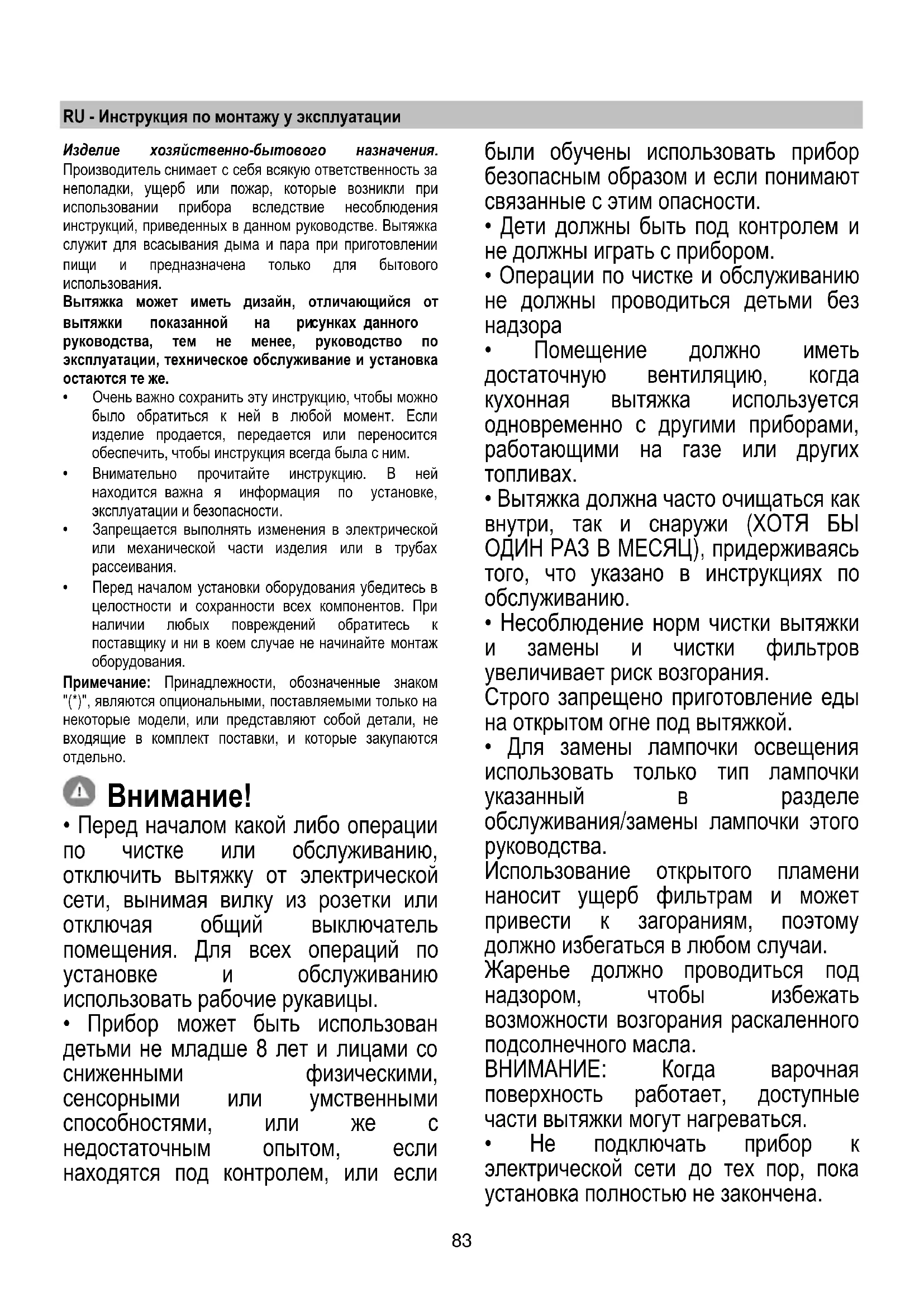 - Вытяжка НИКОГДА не должна использоваться, как опорная поверхность, если только не указано иначе.