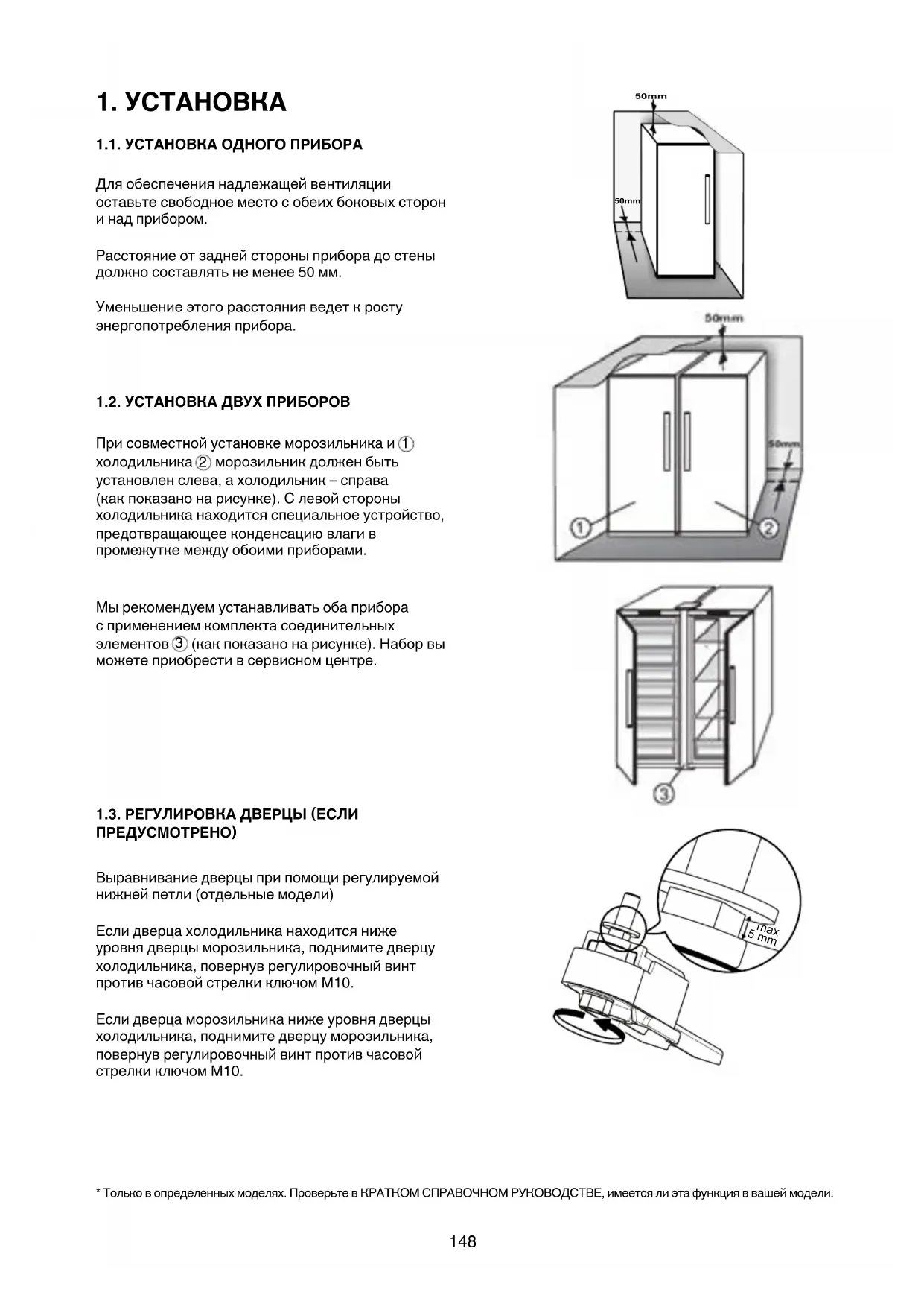 1.1. УСТАНОВКА ОДНОГО ПРИБОРА Дляобеспечениянадлежащейвентиляции оставьтесвободноеместособеихбоковыхсторон инадприбором. Расстояниеотзаднейстороныприборадостены должносоставлятьнеменее50мм. Уменьшениеэтогорасстоянияведеткросту энергопотребленияприбора. 1.2. УСТАНОВКА ДВУХ ПРИБОРОВ Присовместнойустановкеморозильникаи