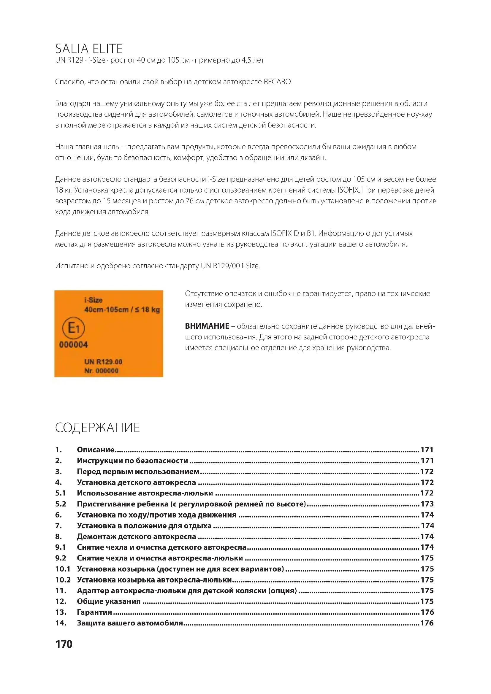 Ukazujemo na činjenicu da se prilikom korišćenja dečjih autosedišta u automobilima ne mogu isključiti oštećenja sedišta u vozilu. Bezbednosna direktiva ECE R129.00 zahteva fiksnu montažu. Zato Vam preporučujemo da za sedišta svog vozila preduzmete odgovarajuće zaštitne mere (npr. RECARO Car Seat Protector). Preduzeće Recaro Kids s.r.l. ili njegovi trgovci ne preuzimaju odgovornost za eventualna oštećenja na sedištima u vozilu.170 SALIA ELITE UN R129 · i-Size · рост от 40см до 105см · примерно до 4,5лет Спасибо, что остановили свой выбор на детском автокресле RECARO. Благодаря нашему уникальному опыту мы уже более ста лет предлагаем революционные решения в области производства сидений для автомобилей, самолетов и гоночных автомобилей. Наше непревзойденное ноу-хау в полной мере отражается в каждой из наших систем детской безопасности. Наша главная цель – предлагать вам продукты, которые всегда превосходили бы ваши ожидания в любом отношении, будь то безопасность, комфорт, удобство в обращении или дизайн. Данное автокресло стандарта безопасности i-Size предназначено для детей ростом до 105см и весом не более 18кг. Установка кресла допускается только с использованием креплений системы ISOFIX. При перевозке детей возрастом до 15месяцев и ростом до 76см детское автокресло должно быть установлено в положении против хода движения автомобиля. Данное детское автокресло соответствует размерным классам ISOFIX D и B1. Информацию о допустимых местах для размещения автокресла можно узнать из руководства по эксплуатации вашего автомобиля. Испытано и одобрено согласно стандарту UN R129/00 i-Size. Отсутствие опечаток и ошибок не гарантируется, право на технические изменения сохранено. ВНИМАНИЕ – обязательно сохраните данное руководство для дальней