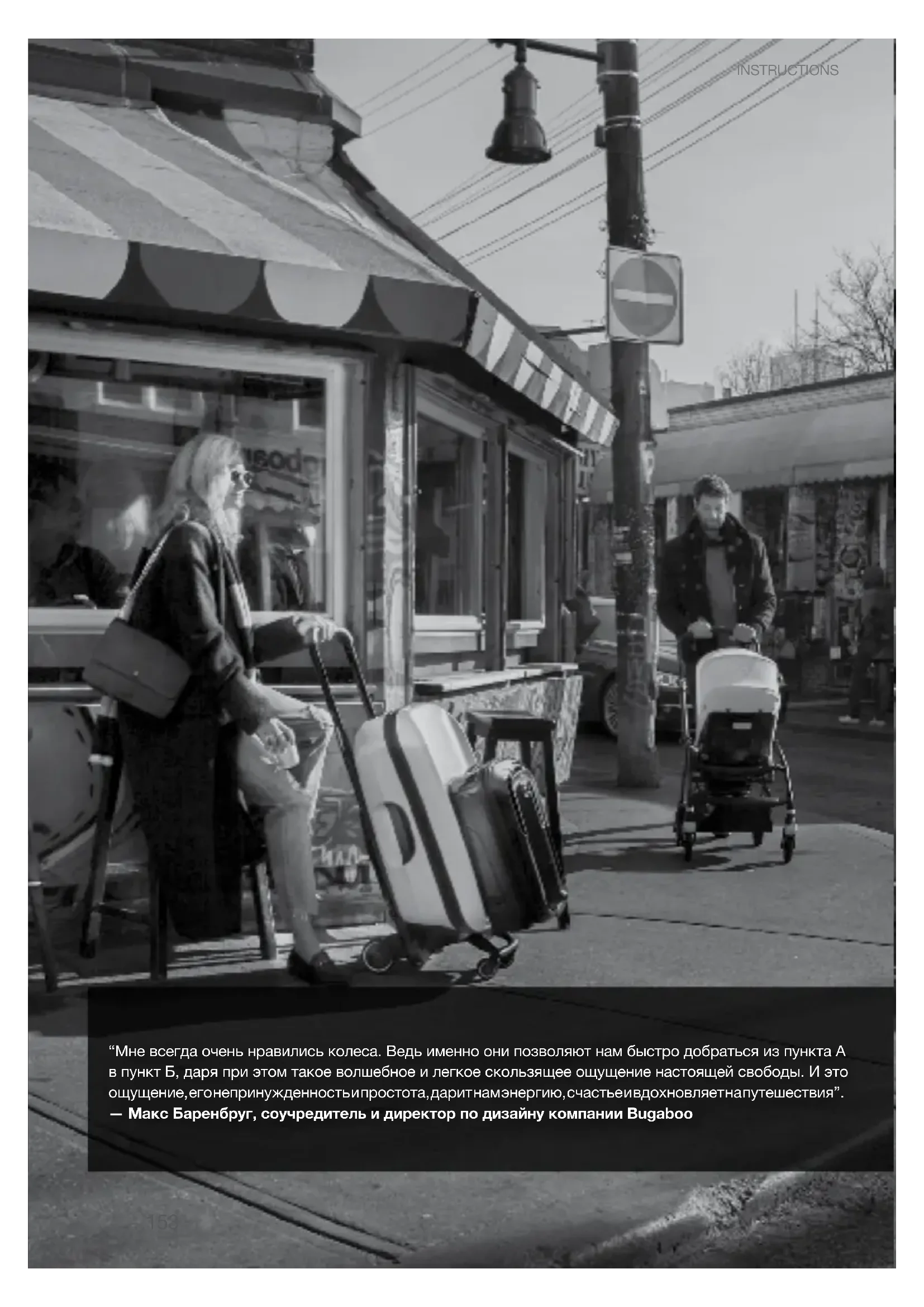 são patenteados e o design é protegido. INSTRUCTIONS153 “Мне всегда очень нравились колеса. Ведь именно они позволяют нам быстро добраться из пункта А в пункт Б, даря при этом такое волшебное и легкое скользящее ощущение настоящей свободы. И это ощущение, его непринужденность и простота, дарит нам энергию, счастье и вдохновляет на путешествия”. — Макс Баренбруг, соучредитель и директор по дизайну компании Bugaboo INSTRUCTIONS8 9 10