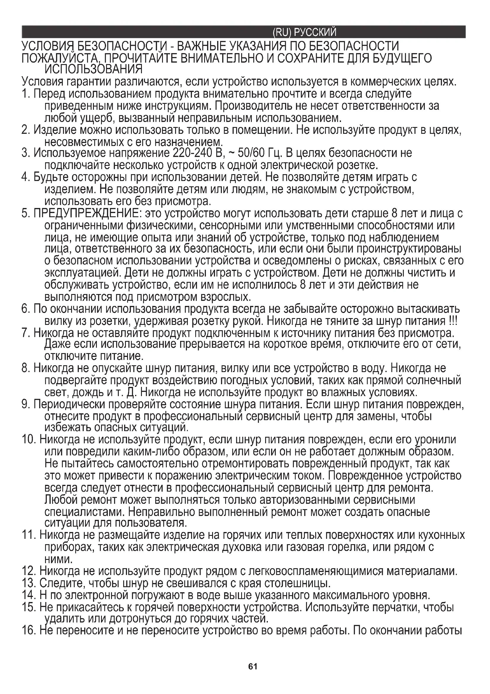 19. Нагревательный элемент остается горячим, когда вынимается вилка, и его нельзя