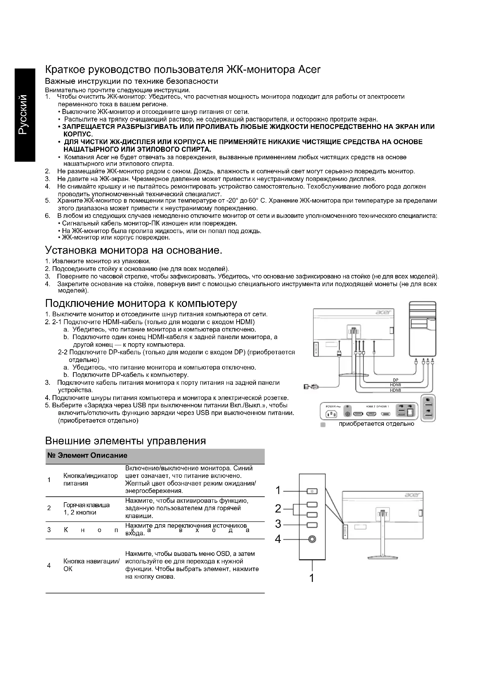 Contraste 100000000:1 no máx. (ACM) Ângulo visível 178° (H) 178° (V) (CR=10) Tempo de resposta 1 ms (G a G) / 0,5 ms (G a G, min.) Tipo de painel IPS (comutação de planos) Frequência horizontal HDMI: 31 - 222 kHz / DP: 31 - 395 kHz Frequência vertical HDMI: 56 - 144 Hz / DP: 56 - 270 Hz Cores do ecrã 16,7 milhões Frequência de pontos HDMI: 595,5 MHz / DP: 1056,97 MHz Resolução máxima HDMI: 2560 x 1440 a 144 Hz / DP: 2560 x 1440 a 240 Hz DP: 2560 x 1440 a 270 Hz (com Over Clock LIGAR) Plug & Play VESA DDCCI/DDC2B Classe de eficiência energética C *Consumo energético anual 86 (kWh) (nos modelos com entrada HDMI) Consumo energético (a 200 cd/m²) Ligado 45 W (habitual) Modo de espera 0,45 W (habitual) Desligado 0,3 W (habitual) Conetor de entrada HDMI (apenas nos modelos com entrada HDMI) / DP (apenas nos modelos com entrada DP) Sinal de entrada de vídeo HDMI (apenas nos modelos com entrada HDMI) (opcional) / DP (apenas nos modelos com entrada DP) (opcional) Colunas 2 W x 2 (apenas nos modelos com entrada de áudio) (opcional) USB USB 3.0 x 4 (opcional) Tamanho máximo do ecrã Horizontal: 708,4 mm Vertical: 398,5 mm Alimentação 100-240 V, 50/60 Hz Considerações ambientais Temperatura de funcionamento: 0 a 40 °C Temperatura de armazenamento: -20 a 60 °C Humidade de funcionamento: 20 a 80% Dimensões 727,48 (L) x 479,18 ~ 609,18 (A) x 269 (P) mm Peso (líquido) 9,5 kg (líquido) Especificações de mecanismos Inclinação: entre -5° e +35° (só é possível disponibilizar 35° de reclinação para o ângulo de elevação no ponto mais elevado) Rotação: 360° Ajuste da altura: entre 0 e 130 mm Articulação: não Apoio amovível: sim Controlos externos Comutador/botões Botão de alimentação Tecla de atalho 1 Tecla de atalho 2 Input Menu/Navi/OK Funções Luminosidade Contraste Luz azul Intensif. preto ACM HDR*** Super nitidez Gamma Temp. Cor Modos Espaço de cor Modo esc. cinza Tonalid. 6 eixos Satur. 6 eixos Volume Sem som Over Drive FreeSync Premium** Núm freq atualiz Latência ultrabaixa Ponto de mira Idioma Tempo limite OSD Transparência Bloquear OSD Entrada Fonte Auto Formato DP Atribuição tecla atalho Modo Panorâmico PIP/PBP DDC/CI Nív. preto HDMI Modo início ráp. Over Clock# Carregamento USB no modo desligado Informações do ecrã Repor todas definições Sair As especificações variam consoante o modelo e a região.Русский Краткое руководство пользователя ЖК-монитора Acer Важные инструкции по технике безопасности Внимательно прочтите следующие инструкции.