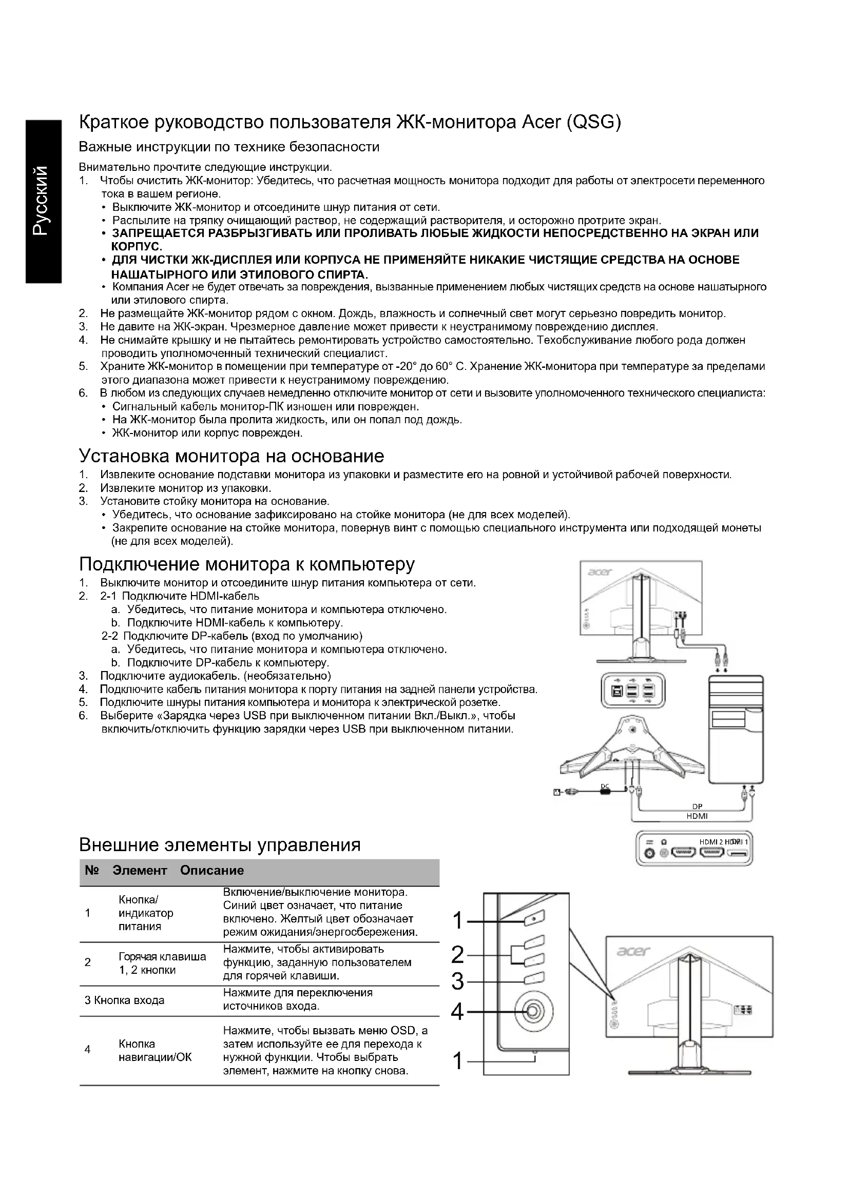 Примечание: Чтобы не повредить монитор, не поднимайте его за основание. Примечание: Экранированные кабели Все подключения к другим вычислительным устройствам должны производиться с помощью экранированных кабелей в соответствии с правилами электромагнитной совместимости. Примечание: Монитор Acer предназначен для воспроизведения видеосигнала и визуального отображения информации, полученной с электронных носителей. Примечание: Периферийные устройства К данному оборудованию можно подключать только периферийные устройства (устройства ввода/вывода, оконечные устройства, принтеры и т. д.), сертифицированные на соответствие ограничениям класса B. Использование несертифицированных периферийных устройств может привести к возникновению помех в приеме радио- и телевизионных сигналов. Предупреждение Изменения или модификации, не одобренные производителем, могут привести к лишению пользователя полномочий на эксплуатацию данного устройства, предоставленных Федеральной комиссией по средствам коммуникаций. Условия эксплуатации Данное устройство соответствует требованиям части 15 правил FCC. Эксплуатация допускается при соблюдении следующих двух условий: (1) данное устройство не должно создавать вредных помех, и (2) данное устройство может принимать любые помехи, включая помехи, которые могут препятствовать нормальной эксплуатации. Примечание: Для пользователей в Канаде Данное цифровое устройство класса B соответствует канадскому стандарту ICES-003. Remarque à l'intention des utilisateurs canadiens Cet appareil numérique de la classe B est conforme à la norme NMB-003 du Canada. Утилизация отслужившего оборудования пользователями из частных домов в странах Европейского Союза Этот символ на устройстве или упаковке означает, что данное устройство нельзя утилизировать вместе с другими бытовыми отходами. Вместо этого необходимо сдать отслужившее устройство в специальный пункт приема для утилизации электрического и электронного оборудования. Отдельный сбор и переработка отслужившего оборудования во время утилизации поможет сберечь природные ресурсы и обеспечить переработку таким образом, чтобы защитить здоровье человека и окружающую среду. Для получения более подробной информации о том, куда можно сдать отслужившее оборудование для утилизации, обратитесь в местный орган городского управления, службу сбора бытовых отходов или в магазин, где было приобретено устройство.Русский Спецификации Руководства и другие документы для вашего продукта Acer можно найти на официальном веб-сайте технической поддержки Acer.