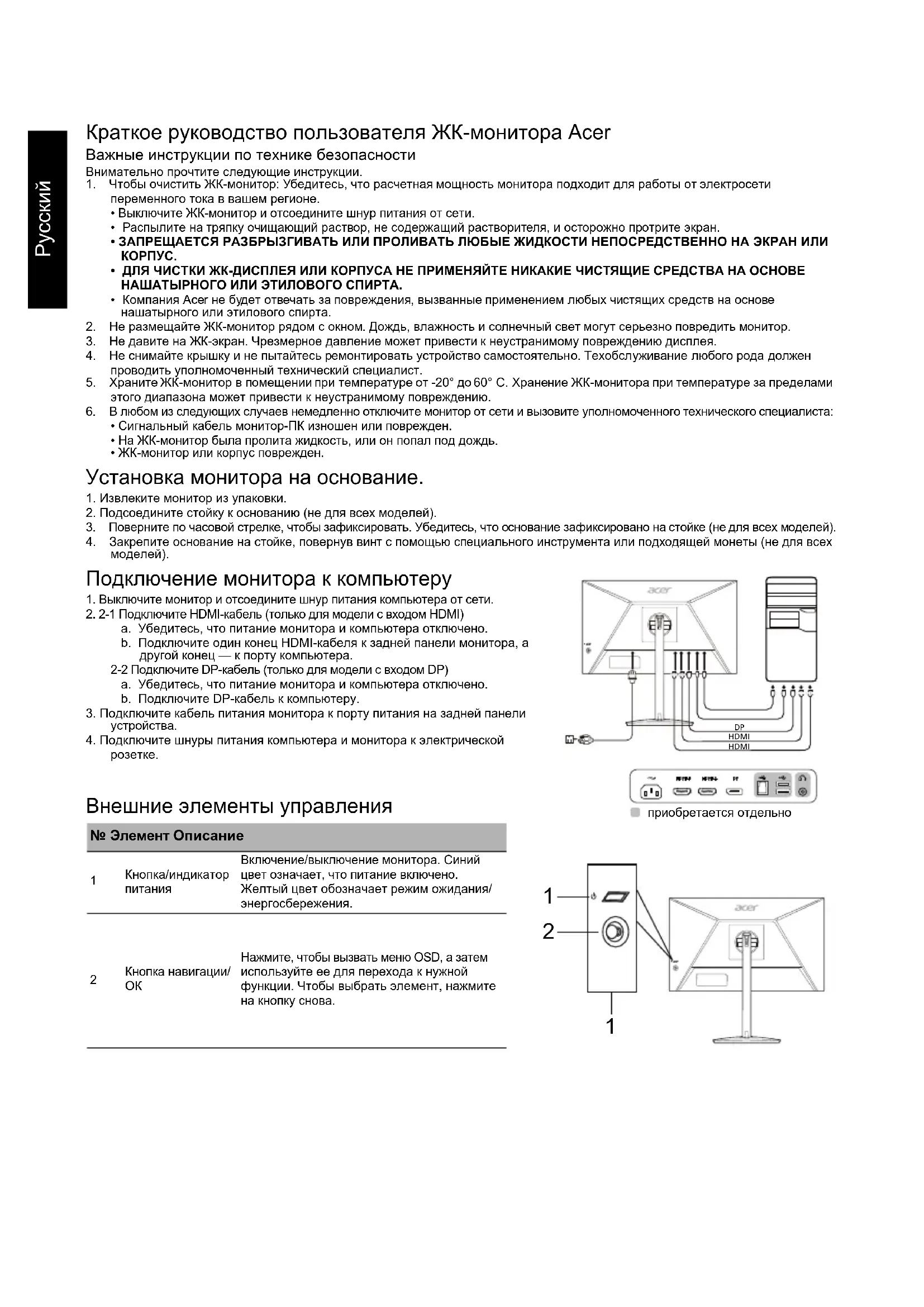Подключение монитора к компьютеру 1. Выключите монитор и отсоедините шнур питания компьютера от сети.2. 2-1 Подключите HDMI-кабель (только для модели с входом HDMI)a. Убедитесь, что питание монитора и компьютера отключено.b. Подключите один конец HDMI-кабеля к задней панели монитора, а другой конец — к порту компьютера.2-2 Подключите DP-кабель (только для модели с входом DP)a. Убедитесь, что питание монитора и компьютера отключено.b. Подключите DP-кабель к компьютеру.3. Подключите кабель питания монитора к порту питания на задней панели устройства.4. Подключите шнуры питания компьютера и монитора к электрической розетке. Внешние элементы управления № Элемент Описание