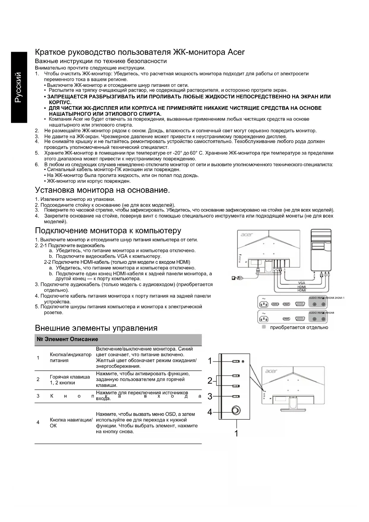 Подключение монитора к компьютеру 1. Выключите монитор и отсоедините шнур питания компьютера от сети.2. 2-1 Подключите видеокабельa. Убедитесь, что питание монитора и компьютера отключено.b. Подключите видеокабель VGA к компьютеру. 2-2 Подключите HDMI-кабель (только для модели с входом HDMI)a. Убедитесь, что питание монитора и компьютера отключено.b. Подключите один конец HDMI-кабеля к задней панели монитора, а другой конец — к порту компьютера.3. Подключите аудиокабель (только модель с аудиовходом) (приобретается отдельно).4. Подключите кабель питания монитора к порту питания на задней панели устройства.5. Подключите шнуры питания компьютера и монитора к электрической розетке. Внешние элементы управления № Элемент Описание