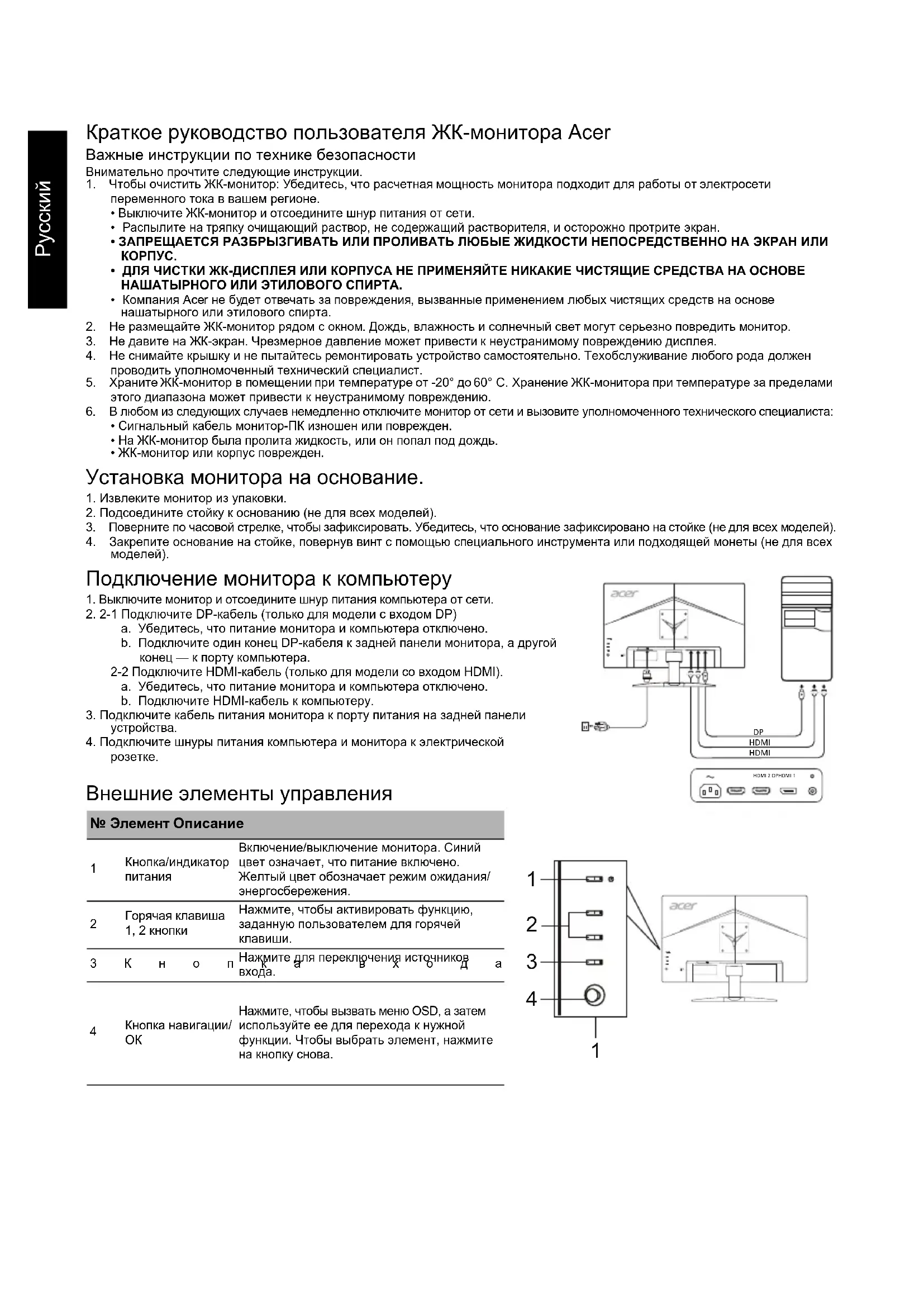 Подключение монитора к компьютеру 1. Выключите монитор и отсоедините шнур питания компьютера от сети.2. 2-1 Подключите DP-кабель (только для модели с входом DP)a. Убедитесь, что питание монитора и компьютера отключено.b. Подключите один конец DP-кабеля к задней панели монитора, а другой конец — к порту компьютера.2-2 Подключите HDMI-кабель (только для модели со входом HDMI).a. Убедитесь, что питание монитора и компьютера отключено.b. Подключите HDMI-кабель к компьютеру.3. Подключите кабель питания монитора к порту питания на задней панели устройства.4. Подключите шнуры питания компьютера и монитора к электрической розетке. Внешние элементы управления № Элемент Описание