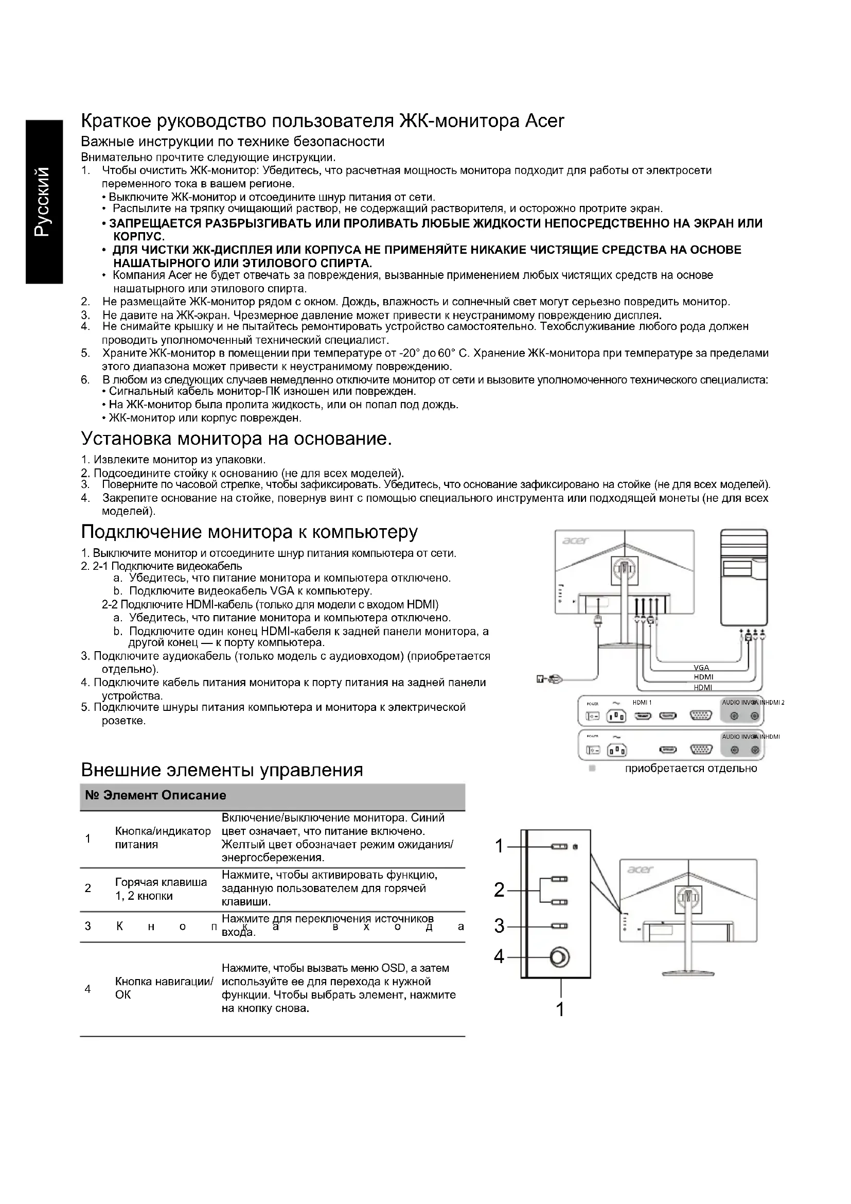 Подключение монитора к компьютеру 1. Выключите монитор и отсоедините шнур питания компьютера от сети.2. 2-1 Подключите видеокабельa. Убедитесь, что питание монитора и компьютера отключено.b. Подключите видеокабель VGA к компьютеру. 2-2 Подключите HDMI-кабель (только для модели с входом HDMI)a. Убедитесь, что питание монитора и компьютера отключено.b. Подключите один конец HDMI-кабеля к задней панели монитора, а другой конец — к порту компьютера.3. Подключите аудиокабель (только модель с аудиовходом) (приобретается отдельно).4. Подключите кабель питания монитора к порту питания на задней панели устройства.5. Подключите шнуры питания компьютера и монитора к электрической розетке. Внешние элементы управления № Элемент Описание