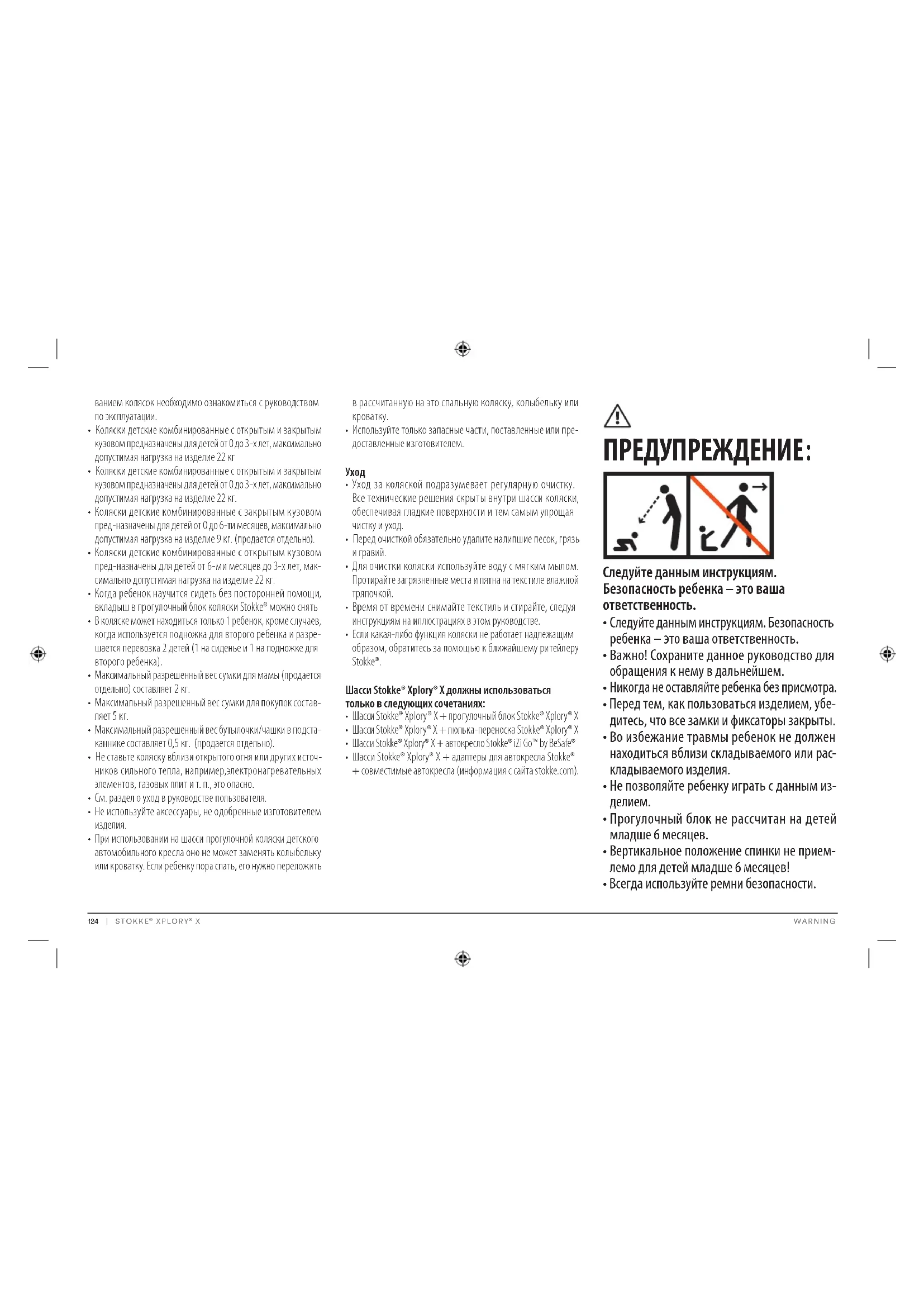 Если какая-либо функция коляски не работает надлежащим образом, обратитесь за помощью к ближайшему ритейлеру Stokke®. Шасси Stokke® Xplory® X должны использоваться только в следующих сочетаниях: