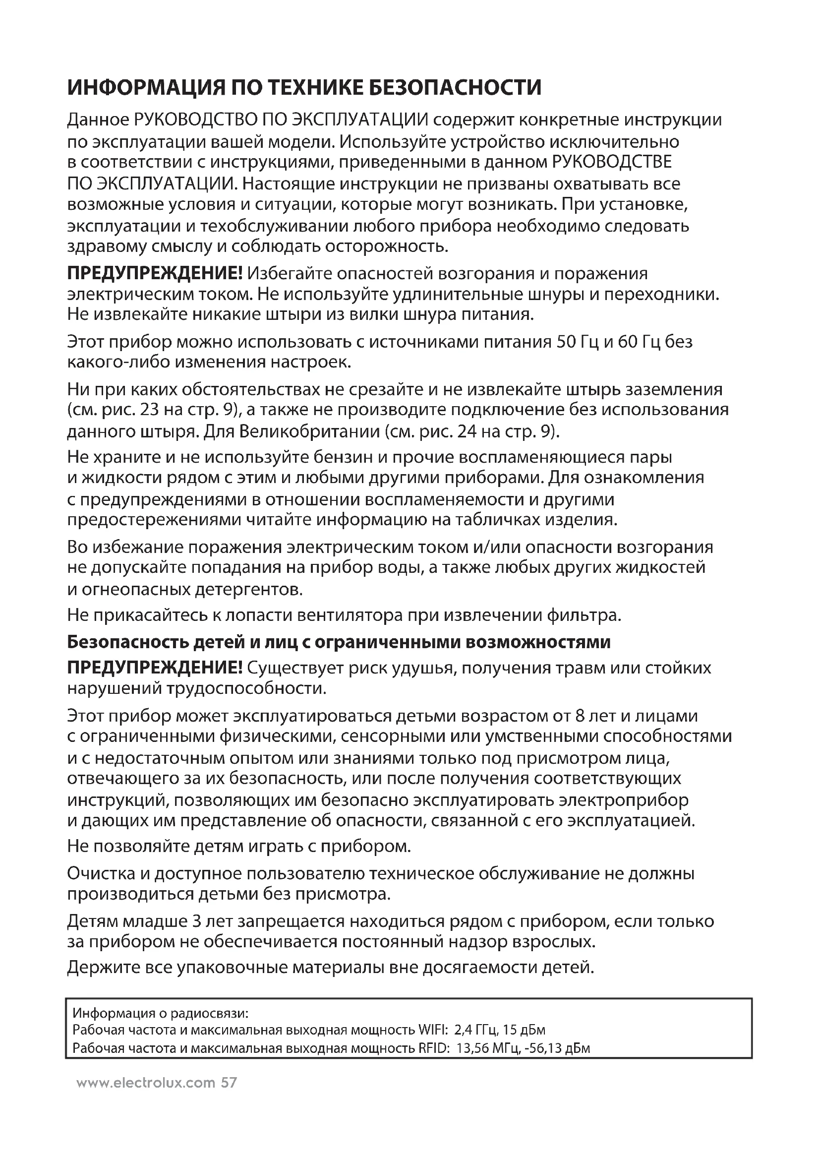 CSwww.electrolux.com 57 ИНФОРМАЦИЯ ПО ТЕХНИКЕ БЕЗОПАСНОСТИ Данное РУКОВОДСТВО ПО ЭКСПЛУАТАЦИИ содержит конкретные инструкции поэксплуатации вашей модели. Используйте устройство исключительно всоответствии с инструкциями, приведенными в данном РУКОВОДСТВЕ ПОЭКСПЛУАТАЦИИ. Настоящие инструкции не призваны охватывать все возможные условия и ситуации, которые могут возникать. При установке, эксплуатации и техобслуживании любого прибора необходимо следовать здравому смыслу и соблюдать осторожность. ПРЕДУПРЕЖДЕНИЕ! Избегайте опасностей возгорания и поражения электрическим током. Не используйте удлинительные шнуры и переходники. Неизвлекайте никакие штыри из вилки шнура питания. Этот прибор можно использовать с источниками питания 50Гц и 60Гц без какого-либо изменения настроек. Ни при каких обстоятельствах не срезайте и не извлекайте штырь заземления (см. рис. 23 на стр. 9), а также не производите подключение без использования данного штыря. Для Великобритании (см. рис. 24 на стр. 9). Не храните и не используйте бензин и прочие воспламеняющиеся пары ижидкости рядом с этим и любыми другими приборами. Для ознакомления спредупреждениями в отношении воспламеняемости и другими предостережениями читайте информацию на табличках изделия. Во избежание поражения электрическим током и/или опасности возгорания недопускайте попадания на прибор воды, а также любых других жидкостей иогнеопасных детергентов. Не прикасайтесь к лопасти вентилятора при извлечении фильтра. Безопасность детей и лиц с ограниченными возможностями ПРЕДУПРЕЖДЕНИЕ! Существует риск удушья, получения травм или стойких нарушений трудоспособности. Этот прибор может эксплуатироваться детьми возрастом от 8лет и лицами сограниченными физическими, сенсорными или умственными способностями ис недостаточным опытом или знаниями только под присмотром лица, отвечающего за их безопасность, или после получения соответствующих инструкций, позволяющих им безопасно эксплуатировать электроприбор идающих им представление об опасности, связанной с его эксплуатацией. Не позволяйте детям играть с прибором. Очистка и доступное пользователю техническое обслуживание не должны производиться детьми без присмотра. Детям младше 3 лет запрещается находиться рядом с прибором, если только заприбором не обеспечивается постоянный надзор взрослых. Держите все упаковочные материалы вне досягаемости детей. Информация о радиосвязи: Рабочая частота и максимальная выходная мощность WIFI: 2,4 ГГц, 15 дБм Рабочая частота и максимальная выходная мощность RFID: 13,56 МГц, -56,13 дБмwww.electrolux.com58 Информация об электрической части ПРЕДУПРЕЖДЕНИЕ! Избегайте опасностей возгорания ипоражения электрическим током. Если вы не уверены в том, что розетка должным образом заземлена или защищена с помощью плавкого предохранителя с задержкой срабатывания или автоматического выключателя, попросите квалифицированного электрика установить надлежащую розетку в соответствии с Нормами проектирования, установки и эксплуатации электрического оборудования США, атакже применимыми местными нормами и законами. Не используйте удлинительные шнуры и переходники. Никогда не тяните за шнур питания, чтобы отсоединить устройство. Всегда надежно держитесь за вилку ивытаскивайте ее перпендикулярно розетке. Не пережимайте, не перегиба