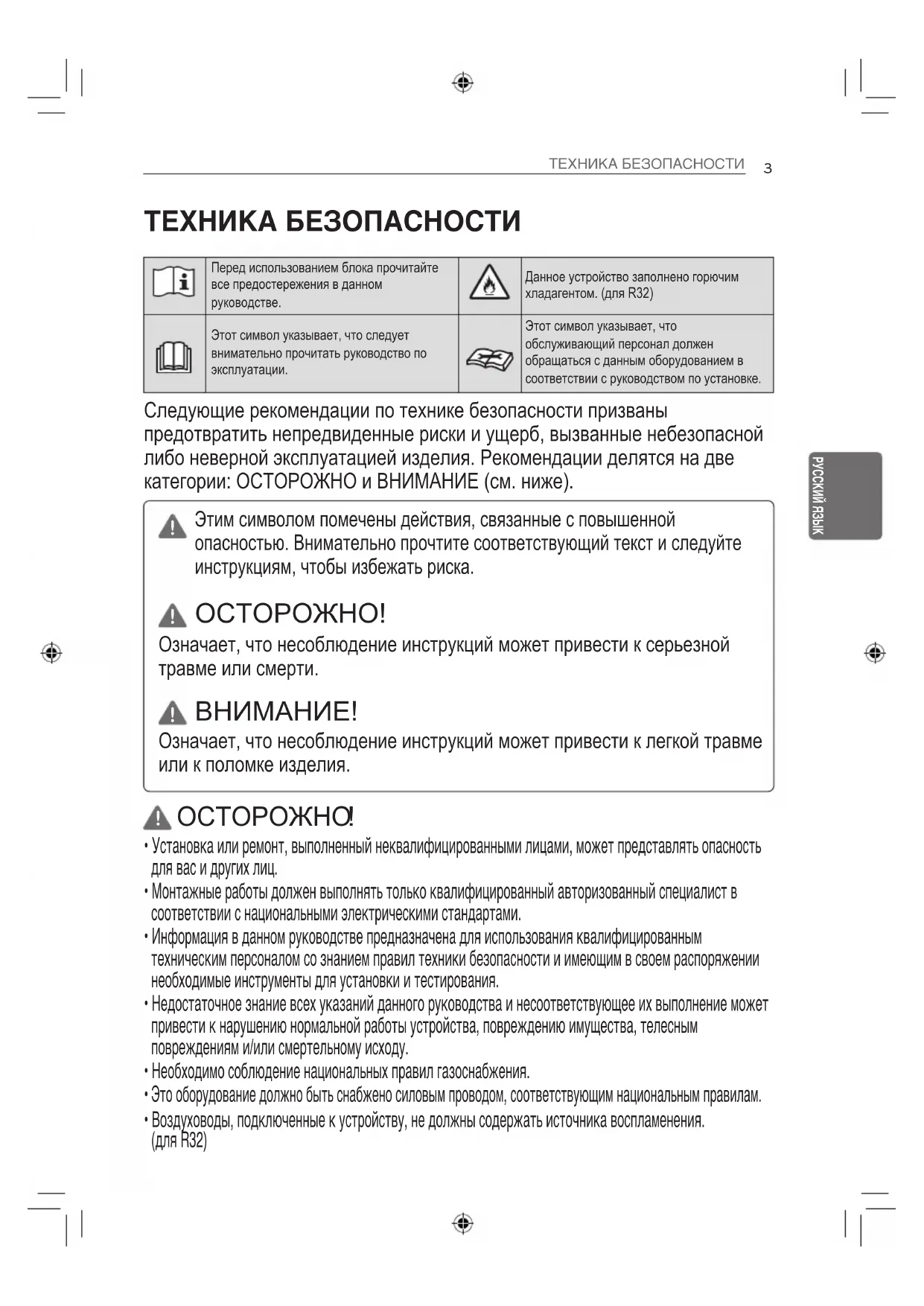 Следующие рекомендации по технике безопасности призваны предотвратить непредвиденные риски и ущерб, вызванные небезопасной либо неверной эксплуатацией изделия. Рекомендации делятся на две категории: ОСТОРОЖНО и ВНИМАНИЕ (см. ниже). ТЕХНИКА БЕЗОПАСНОСТИ Перед использованием блока прочитайте все предостережения в данном руководстве. Данное устройство заполнено горючим хладагентом. (для R32) Этот символ указывает, что следует внимательно прочитать руководство по эксплуатации. Этот символ указывает, что обслуживающий персонал должен обращаться с данным оборудованием в соответствии с руководством по установке.4 ТЕХНИКА БЕЗОПАСНОСТИ РУССКИЙ ЯЗЫК