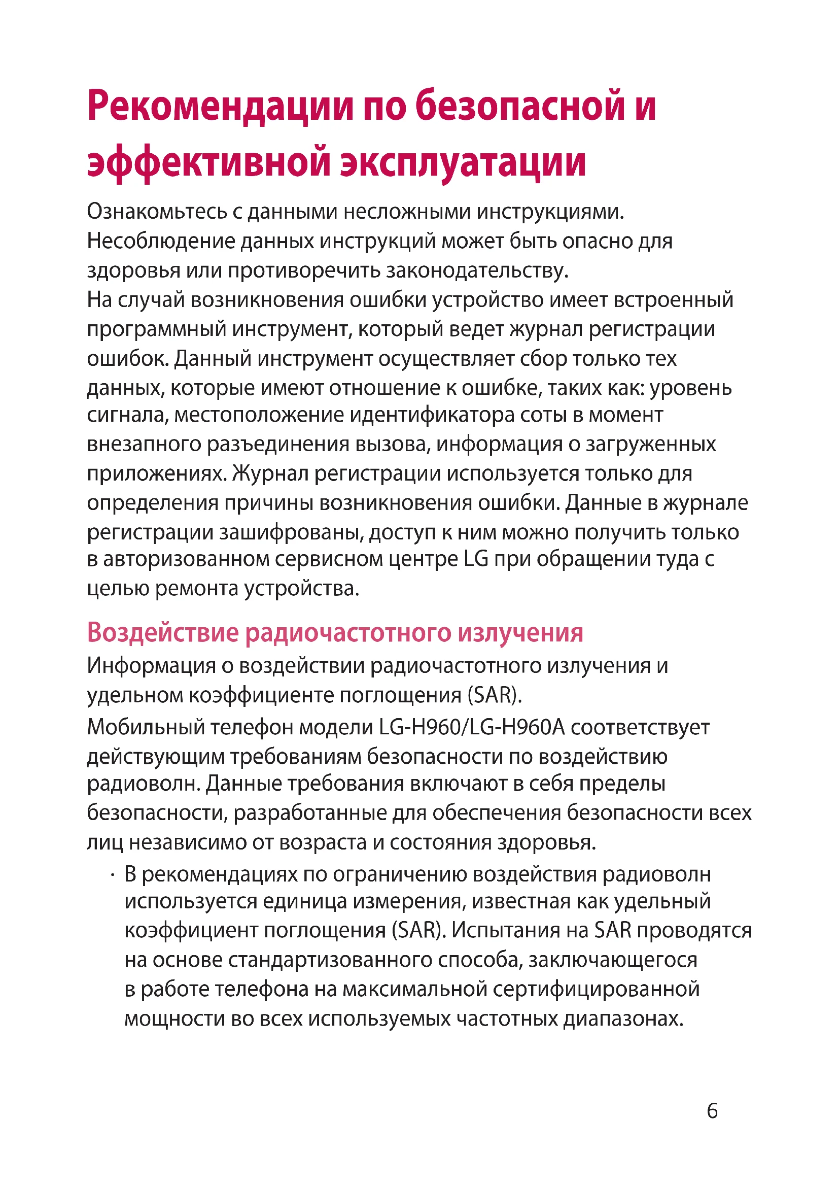 - LG Electronics (Levant) - Jordan Рекомендации по безопасной и эффективной эксплуатации Ознакомьтесь с данными несложными инструкциями. Несоблюдение данных инструкций может быть опасно для здоровья или противоречить законодательству. На случай возникновения ошибки устройство имеет встроенный программный инструмент, который ведет журнал регистрации ошибок. Данный инструмент осуществляет сбор только тех данных, которые имеют отношение к ошибке, таких как: уровень сигнала, местоположение идентификатора соты в момент внезапного разъединения вызова, информация о загруженных приложениях. Журнал регистрации используется только для определения причины возникновения ошибки. Данные в журнале регистрации зашифрованы, доступ к ним можно получить только в авторизованном сервисном центре LG при обращении туда с целью ремонта устройства. Воздействие радиочастотного излучения Информация о воздействии радиочастотного излучения и удельном коэффициенте поглощения (SAR). Мобильный телефон модели LG-H960/LG-H960A соответствует действующим требованиям безопасности по воздействию радиоволн. Данные требования включают в себя пределы безопасности, разработанные для обеспечения безопасности всех лиц независимо от возраста и состояния здоровья. p. 1246