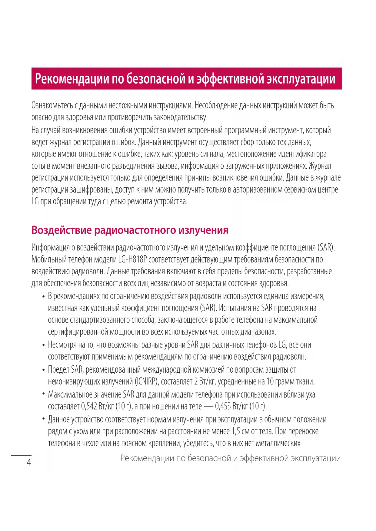 - FAQ Рекомендации по безопасной и эффективной эксплуатации Ознакомьтесь с данными несложными инструкциями. Несоблюдение данных инструкций может быть опасно для здоровья или противоречить законодательству. На случай возникновения ошибки устройство имеет встроенный программный инструмент, который ведет журнал регистрации ошибок. Данный инструмент осуществляет сбор только тех данных, которые имеют отношение к ошибке, таких как: уровень сигнала, местоположение идентификатора соты в момент внезапного разъединения вызова, информация о загруженных приложениях. Журнал регистрации используется только для определения причины возникновения ошибки. Данные в журнале регистрации зашифрованы, доступ к ним можно получить только в авторизованном сервисном центре LG при обращении туда с целью ремонта устройства. Воздействие радиочастотного излучения Информация о воздействии радиочастотного излучения и удельном коэффициенте поглощения (SAR). Мобильный телефон модели LG-H818P соответствует действующим требованиям безопасности по воздействию радиоволн. Данные требования включают в себя пределы безопасности, разработанные для обеспечения безопасности всех лиц независимо от возраста и состояния здоровья. p. 1014