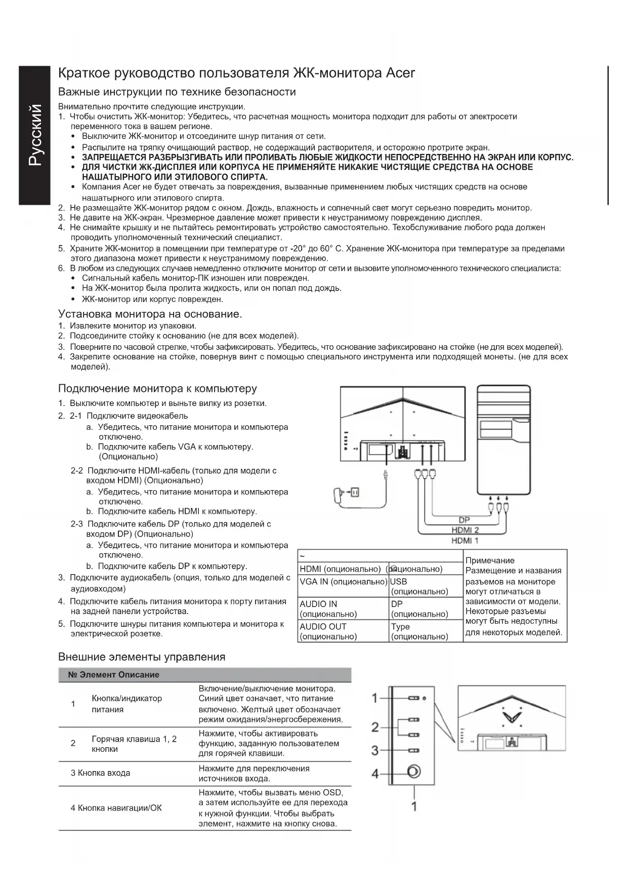 Обратитесь за помощью к дилеру или опытному специалисту по радио-/телевизионному оборудованию. Декларация соответствия CE Настоящим компания Acer Inc., заявляет, что данный ЖК-монитор соответствует основным требованиям и другим соответствующим положениям Директивы по электромагнитной совместимости 2014/30/EU, Директивы по низковольтному оборудованию 2014/35/ EU, Директивы об ограничении использования некоторых вредных веществ в электрическом и электронном оборудовании 2011/65/EU и Директивы 2009/125/EC относительно создания основы для установки требований к экодизайну энергосберегающего продукта. Примечание: Чтобы не повредить монитор, не поднимайте его за основание. Примечание: Экранированные кабели Все подключения к другим вычислительным устройствам должны производиться с помощью экранированных кабелей в соответствии с правилами электромагнитной совместимости. Примечание: Монитор Acer предназначен для воспроизведения видео и визуального отображения данных с электронных устройств. Примечание: Периферийные устройства К данному оборудованию можно подключать только периферийные устройства (устройства ввода/вывода, оконечные устройства, принтеры и т. д.), сертифицированные на соответствие ограничениям класса B. Использование несертифицированных периферийных устройств может привести к возникновению помех в приеме радио- и телевизионных сигналов. Предупреждение Изменения или модификации, не одобренные производителем, могут привести к лишению пользователя полномочий на эксплуатацию данного устройства, предоставленных Федеральной комиссией по средствам коммуникаций. Условия эксплуатации Данное устройство соответствует требованиям части 15 правил FCC. Эксплуатация допускается при соблюдении следующих двух условий: (1) данное устройство не должно создавать вредных помех, и (2) данное устройство может принимать любые помехи, включая помехи, которые могут препятствовать нормальной эксплуатации. Примечание: Для пользователей в Канаде Данное цифровое устройство класса B соответствует канадскому стандарту ICES-003. Remarque à l’intention des utilisateurs canadiens Cet appareil numérique de la classe B est conforme à la norme NMB-003 du Canada. Утилизация отслужившего оборудования пользователями из частных домов в странах Европейского Союза Этот символ на устройстве или упаковке означает, что данное устройство нельзя утилизировать вместе с другими бытовыми отходами. Вместо этого необходимо сдать отслужившее устройство в специальный пункт приема для утилизации электрического и электронного оборудования. Отдельный сбор и переработка отслужившего оборудования во время утилизации поможет сберечь природные ресурсы и обеспечить переработку таким образом, чтобы защитить здоровье человека и окружающую среду. Для получения более подробной информации о том, куда можно сдать отслужившее оборудование для утилизации, обратитесь в местный орган городского управления, службу сбора бытовых отходов или в магазин, где было приобретено устройство.Русский Спецификации