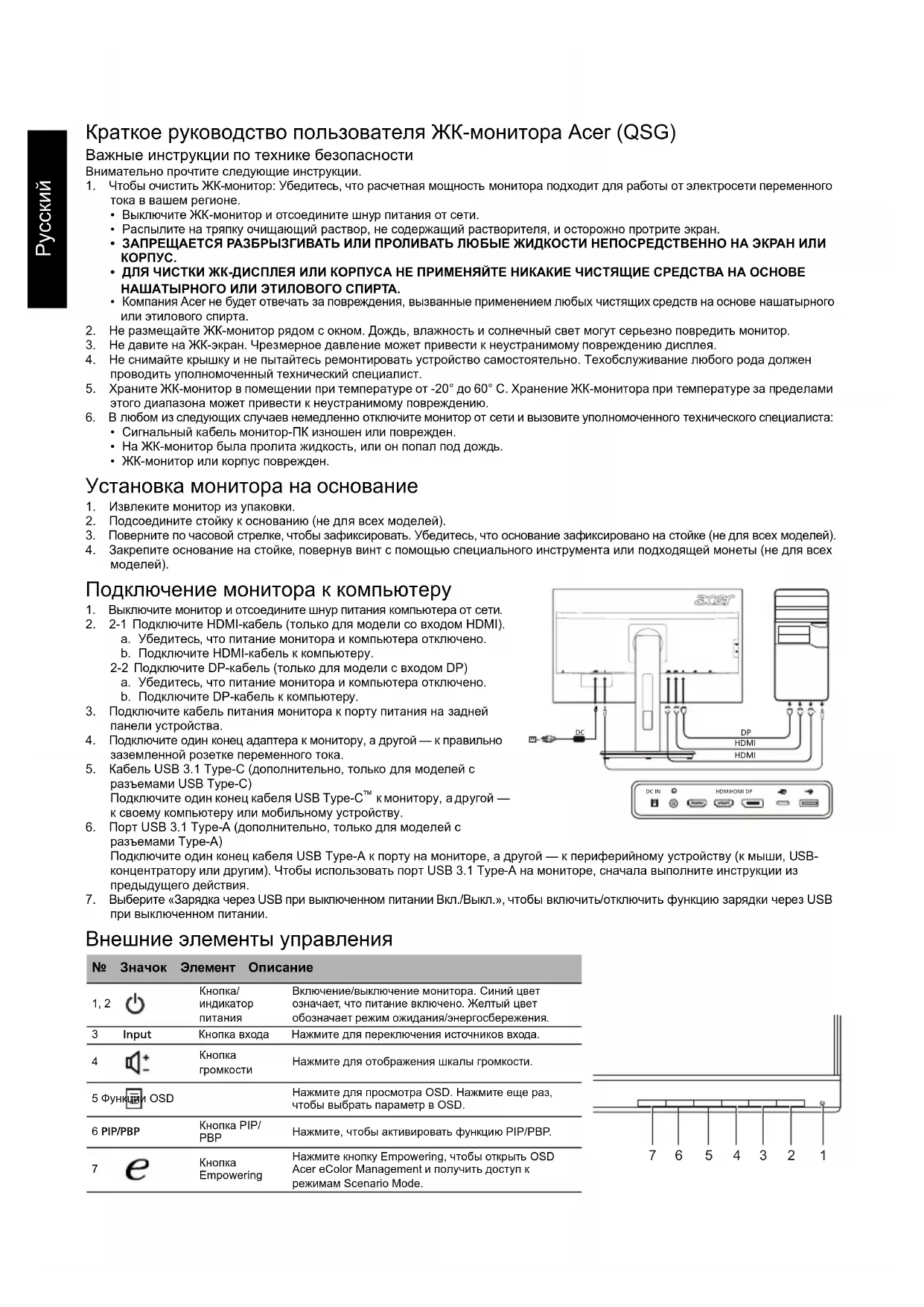 DC IN 1234567Русский Правила и примечания по технике безопасности Примечание FCC Данное устройство было протестировано и признано соответствующим ограничениям для цифрового устройства класса B, в соответствии с частью 15 правил FCC. Эти ограничения разработаны для обеспечения приемлемой защиты от вредных помех при установке в жилых помещениях. Данное устройство генерирует, использует и может излучать радиочастотную энергию. Если оно установлено и используется не в соответствии с инструкциями, оно может вызывать вредные помехи при радиосвязи. Однако нет гарантии, что помехи не будут возникать в каждом конкретном случае. Если данное устройство вызывает вредные помехи для приема радио- и телевизионного сигнала, что можно определить, включив и выключив устройство, пользователю рекомендуется попытаться устранить помехи, выполнив одно или несколько из следующих действий: Переориентируйте или переместите приемную антенну. Увеличьте расстояние между устройством и приемником. Подключите устройство к розетке в цепи, отличной от той, к которой подключен приемник. Обратитесь за помощью к дилеру или опытному специалисту по радио-/телевизионному оборудованию. Декларация соответствия CE Настоящим компания Acer Inc., заявляет, что данный ЖК-монитор соответствует основным требованиям и другим соответствующим положениям Директивы по электромагнитной совместимости 2014/30/EU, Директивы по низковольтному оборудованию 2014/35/ EU, Директивы об ограничении использования некоторых вредных веществ в электрическом и электронном оборудовании 2011/ 65/EU и Директивы 2009/125/EC относительно создания основы для установки требований к экодизайну энергосберегающего