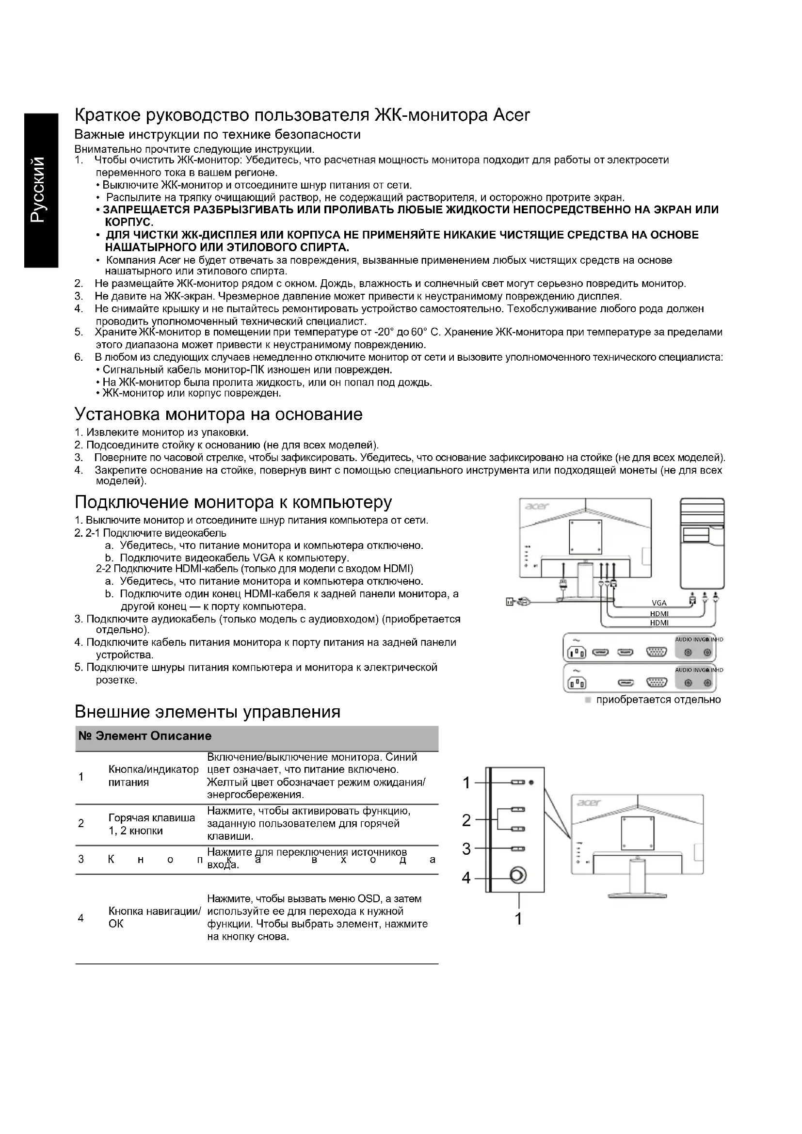 Подключение монитора к компьютеру 1. Выключите монитор и отсоедините шнур питания компьютера от сети.2. 2-1 Подключите видеокабельa. Убедитесь, что питание монитора и компьютера отключено.b. Подключите видеокабель VGA к компьютеру. 2-2 Подключите HDMI-кабель (только для модели с входом HDMI)a. Убедитесь, что питание монитора и компьютера отключено.b. Подключите один конец HDMI-кабеля к задней панели монитора, а другой конец — к порту компьютера.3. Подключите аудиокабель (только модель с аудиовходом) (приобретается отдельно).4. Подключите кабель питания монитора к порту питания на задней панели устройства.5. Подключите шнуры питания компьютера и монитора к электрической розетке. Внешние элементы управления № Элемент Описание