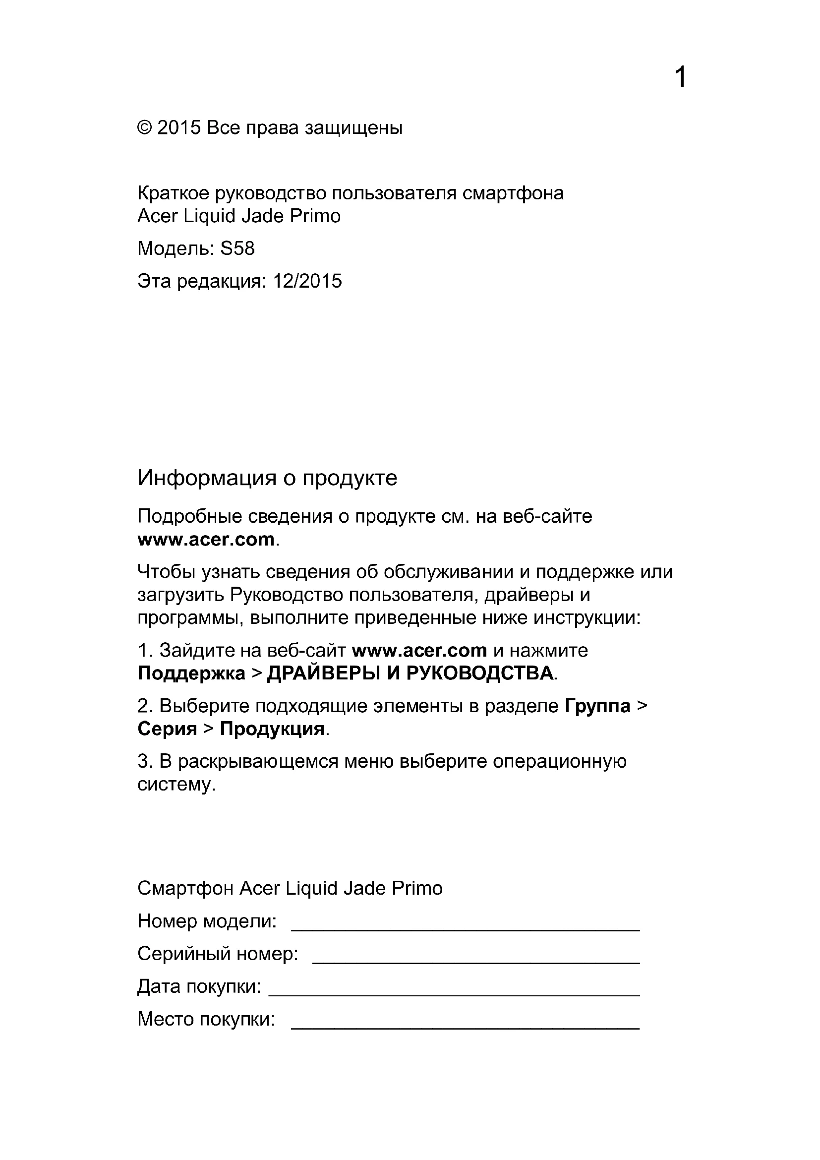 © 2015 Все права защищены Краткое руководство пользователя смартфона Acer Liquid Jade Primo Модель: S58 Эта редакция: 12/2015 Смартфон Acer Liquid Jade Primo Номер модели: ________________________________ Серийный номер: ______________________________ Дата покупки: __________________________________ Место покупки: ________________________________2