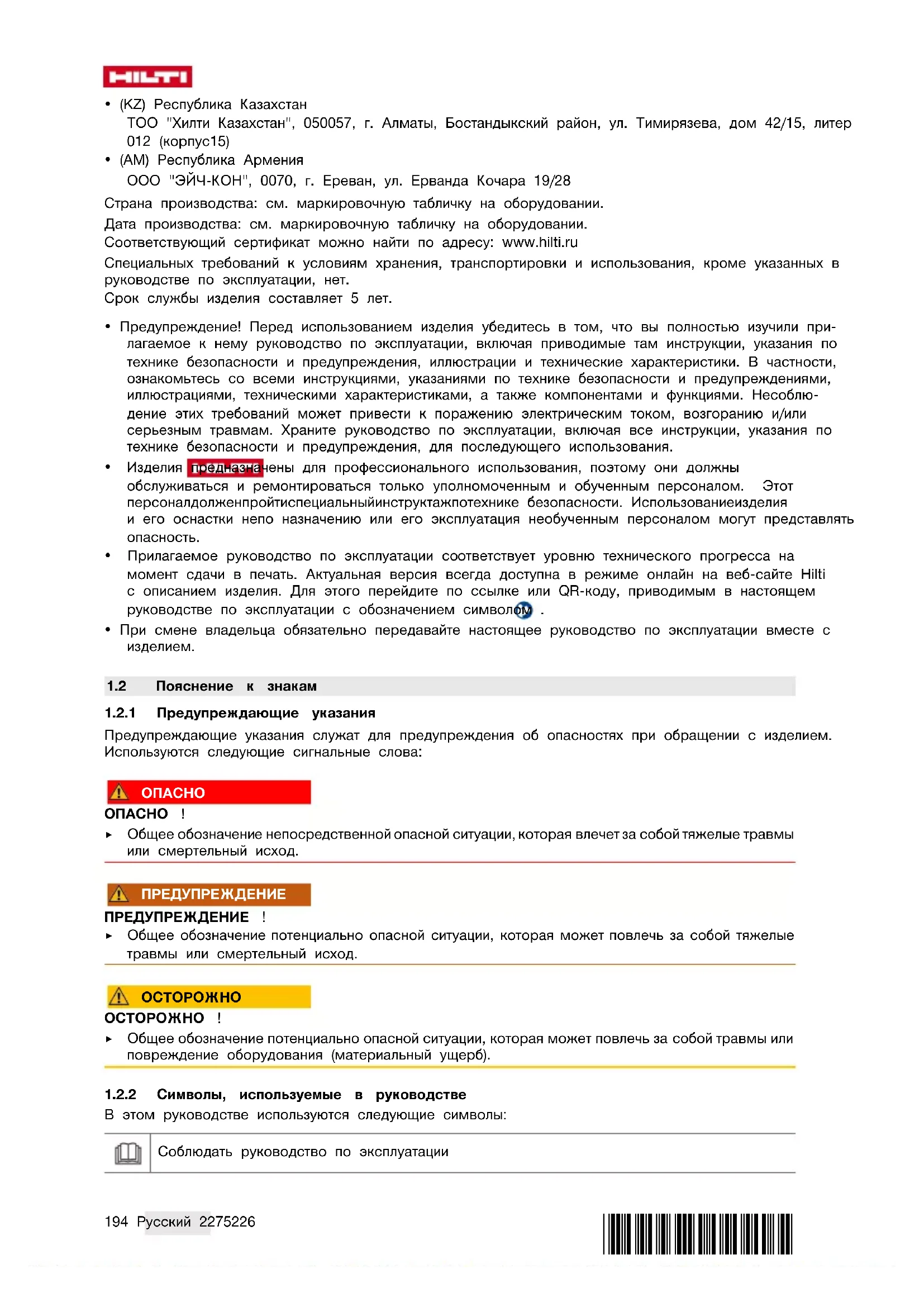 - (AM) Республика Армения ООО "ЭЙЧ-КОН", 0070, г. Ереван, ул. Ерванда Кочара 19/28 Страна производства: см. маркировочную табличку на оборудовании. Дата производства: см. маркировочную табличку на оборудовании. Соответствующий сертификат можно найти по адресу: www.hilti.ru Специальных требований к условиям хранения, транспортировки и использования, кроме указанных в руководстве по эксплуатации, нет. Срок службы изделия составляет 5 лет.