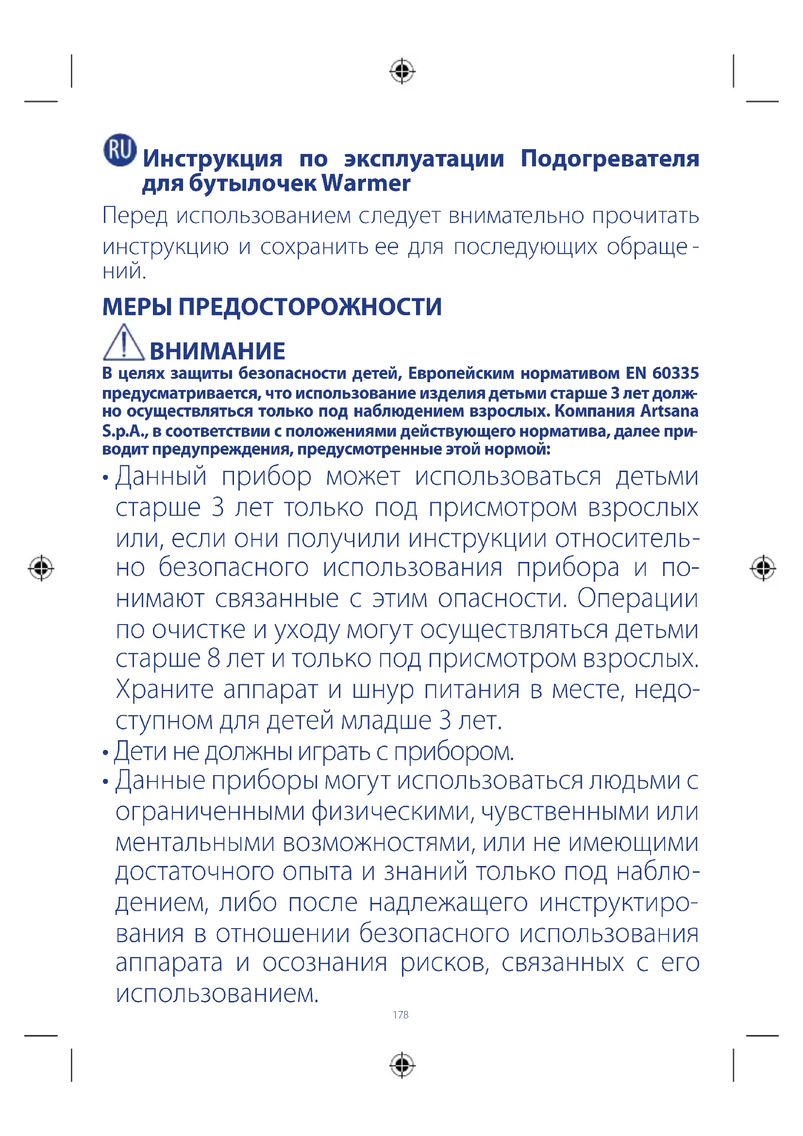 Тем не менее, учитывая характеристики дан- ной категории продукции (электрические подогреватели для бутылочек), компания Artsana S.p.A. не рекомендует детям любого возраста самостоятельно использовать при