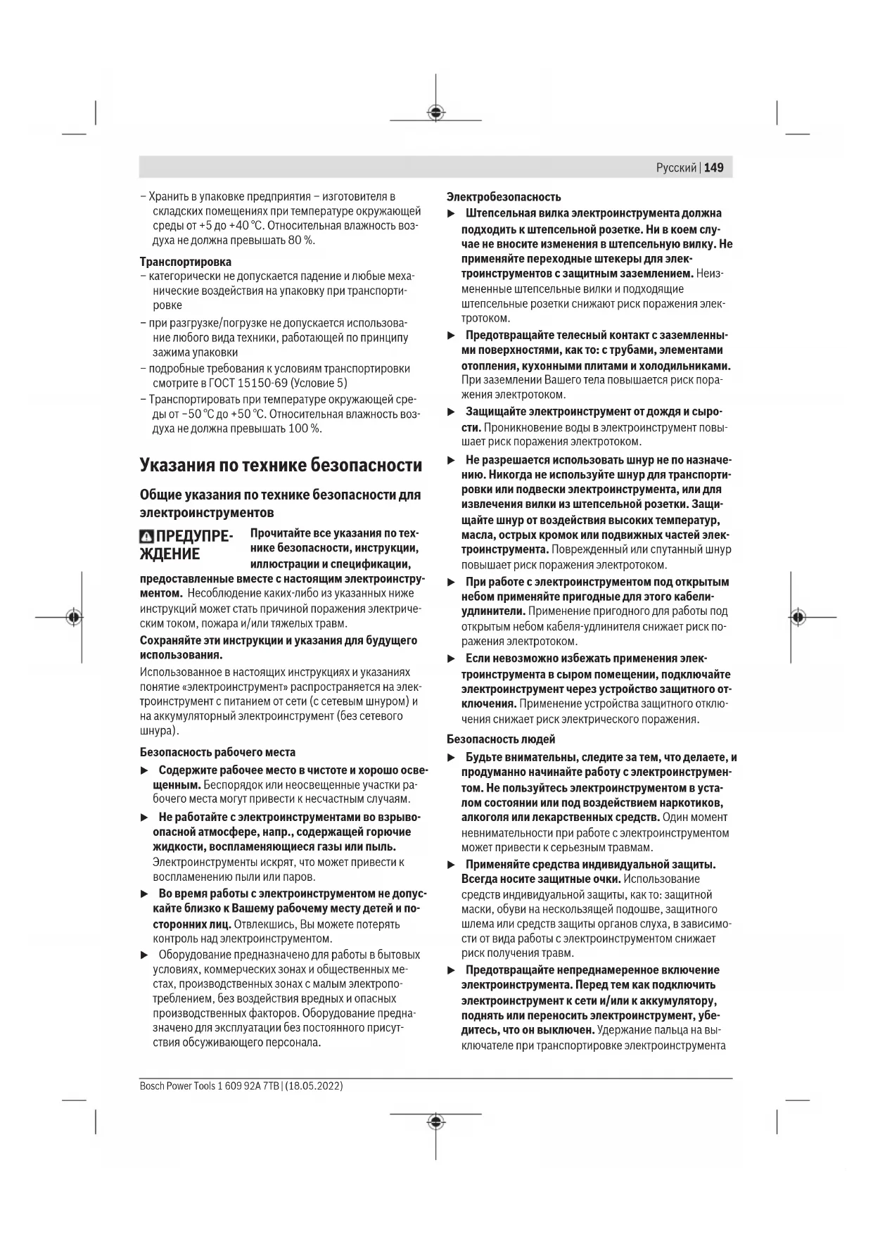 – хранение без упаковки не допускается – подробные требования к условиям хранения смотрите в ГОСТ15150-69 (Условие1) 1 609 92A 7TB | (18.05.2022) Bosch Power ToolsРусский | 149 – Хранить в упаковке предприятия– изготовителя в складских помещениях при температуре окружающей среды от +5 до +40°С. Относительная влажность воз- духа не должна превышать 80%. Транспортировка – категорически не допускается падение и любые меха- нические воздействия на упаковку при транспорти-