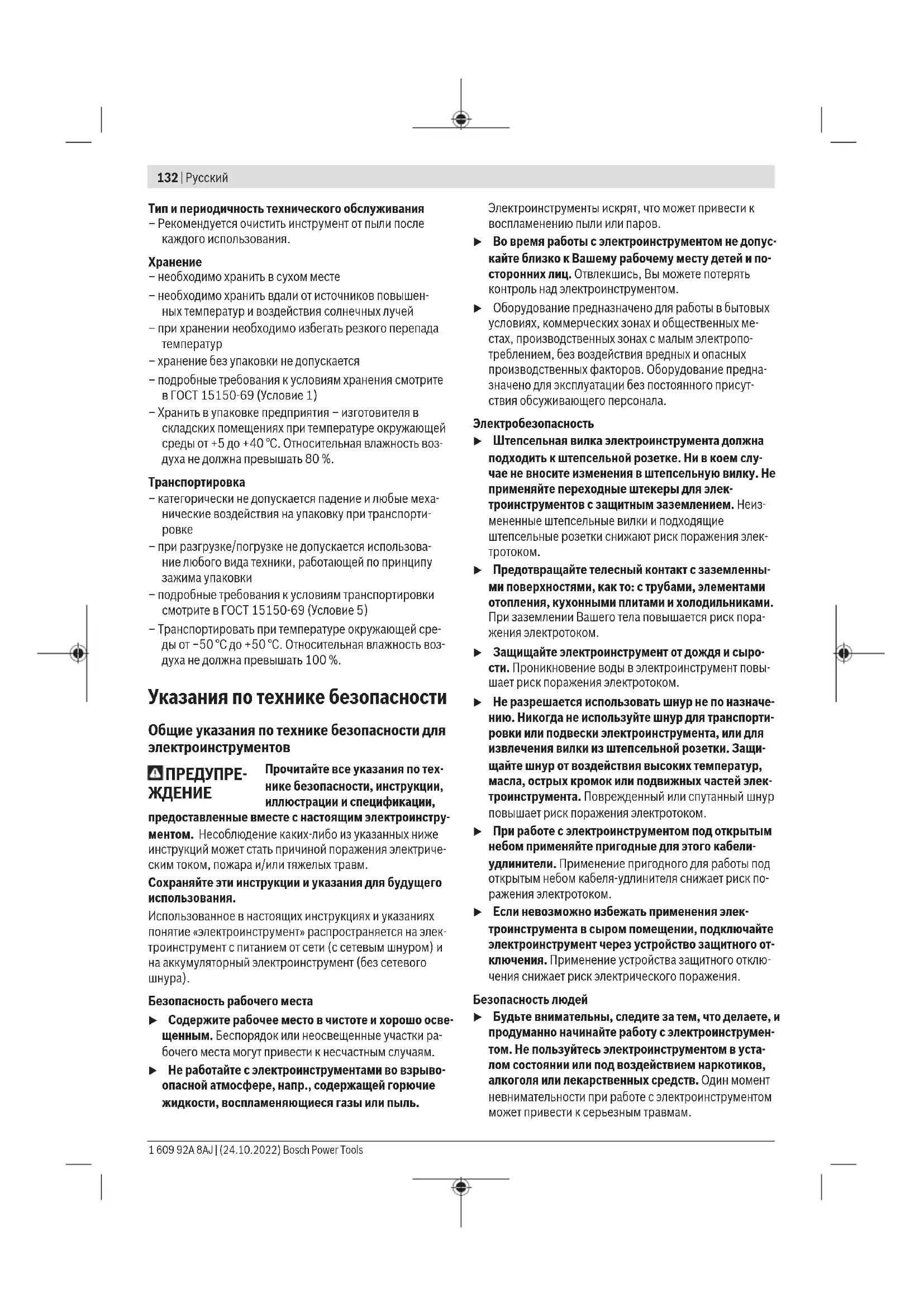 u Предотвращайте телесный контакт с заземленны- ми поверхностями, как то: с трубами, элементами отопления, кухонными плитами и холодильниками. При заземлении Вашего тела повышается риск пора- жения электротоком. u Защищайте электроинструмент от дождя и сыро- сти. Проникновение воды в электроинструмент повы- шает риск поражения электротоком. u Не разрешается использовать шнур не по назначе- нию. Никогда не используйте шнур для транспорти- ровки или подвески электроинструмента, или для извлечения вилки из штепсельной розетки. Защи- щайте шнур от воздействия высоких температур, масла, острых кромок или подвижных частей элек- троинструмента. Поврежденный или спутанный шнур повышает риск поражения электротоком. u При работе с электроинструментом под открытым небом применяйте пригодные для этого кабели- удлинители. Применение пригодного для работы под открытым небом кабеля-удлинителя снижает риск по- ражения электротоком. u Если невозможно избежать применения элек- троинструмента в сыром помещении, подключайте электроинструмент через устройство защитного от- ключения. Применение устройства защитного отклю- чения снижает риск электрического поражения. Безопасность людей u Будьте внимательны, следите за тем, что делаете, и продуманно начинайте работу с электроинструмен- том. Не пользуйтесь электроинструментом в уста- лом состоянии или под воздействием наркотиков, алкоголя или лекарственных средств. Один момент невнимательности при работе с электроинструментом может привести к серьезным травмам. 1 609 92A 8AJ | (24.10.2022) Bosch Power ToolsРусский | 133 u Применяйте средства индивидуальной защиты. Всегда носите защитные очки. Использование средств индивидуальной защиты, как то: защитной маски, обуви на нескользящей подошве, защитного шлема или средств защиты органов слуха, в зависимо- сти от вида работы с электроинструментом снижает риск получения травм. u Предотвращайте непреднамеренное включение электроинструмента. Перед тем как подключить электроинструмент к сети и/или к аккумулятору, поднять или переносить электроинструмент, убе- дитесь, что он выключен. Удержание пальца на вы- ключателе при транспортировке электроинструмента и подключение к сети питания включенного элек- троинструмента чревато несчастными случаями. u Убирайте установочный инструмент или гаечные ключи до включения электроинструмента. Инстру- мент или ключ, находящийся во вращающейся части электроинструмента, может привести к травмам. u Не принимайте неестественное положение корпуса тела. Всегда занимайте устойчивое положение и сохраняйте равновесие. Благодаря этому Вы можете лучше контролировать электроинструмент в неожи- данных ситуациях. u Носите подходящую рабочую одежду. Не носите широкую одежду и украшения. Держите волосы и одежду вдали от подвижных деталей. Широкая оде- жда, украшения или длинные волосы могут быть за- тянуты вращающимися частями. u При наличии возможности установки пылеотсасы- вающих и пылесборных устройств проверяйте их присоединение и правильное использование. При- менение пылеотсоса может снизить опасность, созда- ваемую пылью. u Хорошее знание электроинструментов, полученное в результате частого их использования, не должно приводить к самоуверенности и игнорированию техники безопасности обращения с электроинстру- ментами. Одно не
