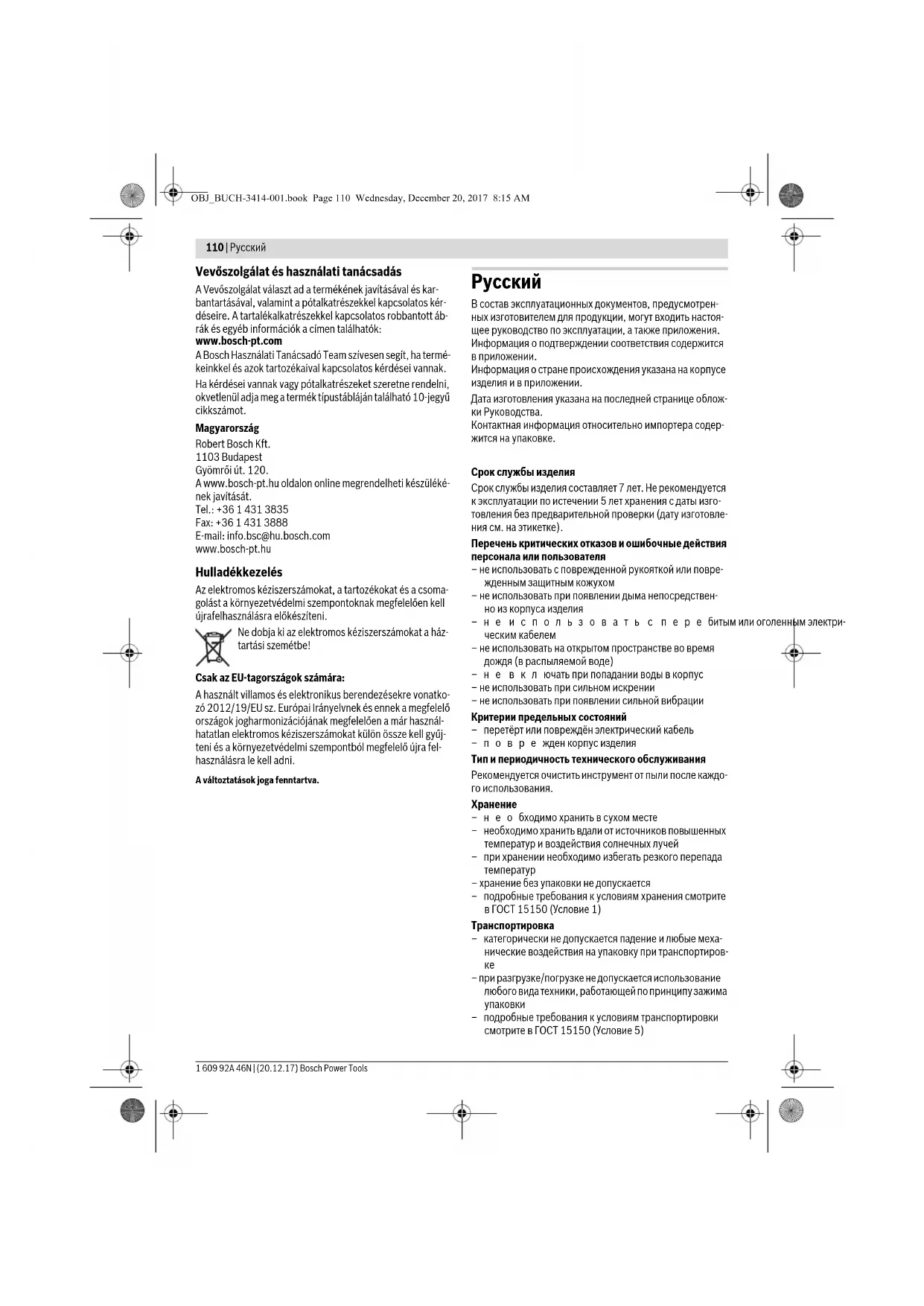 –подробные требования к условиям транспортировки смотрите в ГОСТ 15150 (Условие 5) OBJ_BUCH-3414-001.book Page 110 Wednesday, December 20, 2017 8:15 AMРусский | 111 Bosch Power Tools 1 609 92A 46N | (20.12.17) Указания по безопасности Общие указания по технике безопасности для электроинструментов Прочтите все указания и инструкции по технике безопасности. Несоблюдение указаний и инструкций по технике безопасности может стать причиной поражения электрическим током, пожара и тяжелых травм. Сохраняйте эти инструкции и указания для будущего использования. Использованное в настоящих инструкциях и указаниях понятие «электроинструмент» распространяется на элек- троинструмент с питанием от сети (с сетевым шнуром) и на аккумуляторный электроинструмент (без сетевого