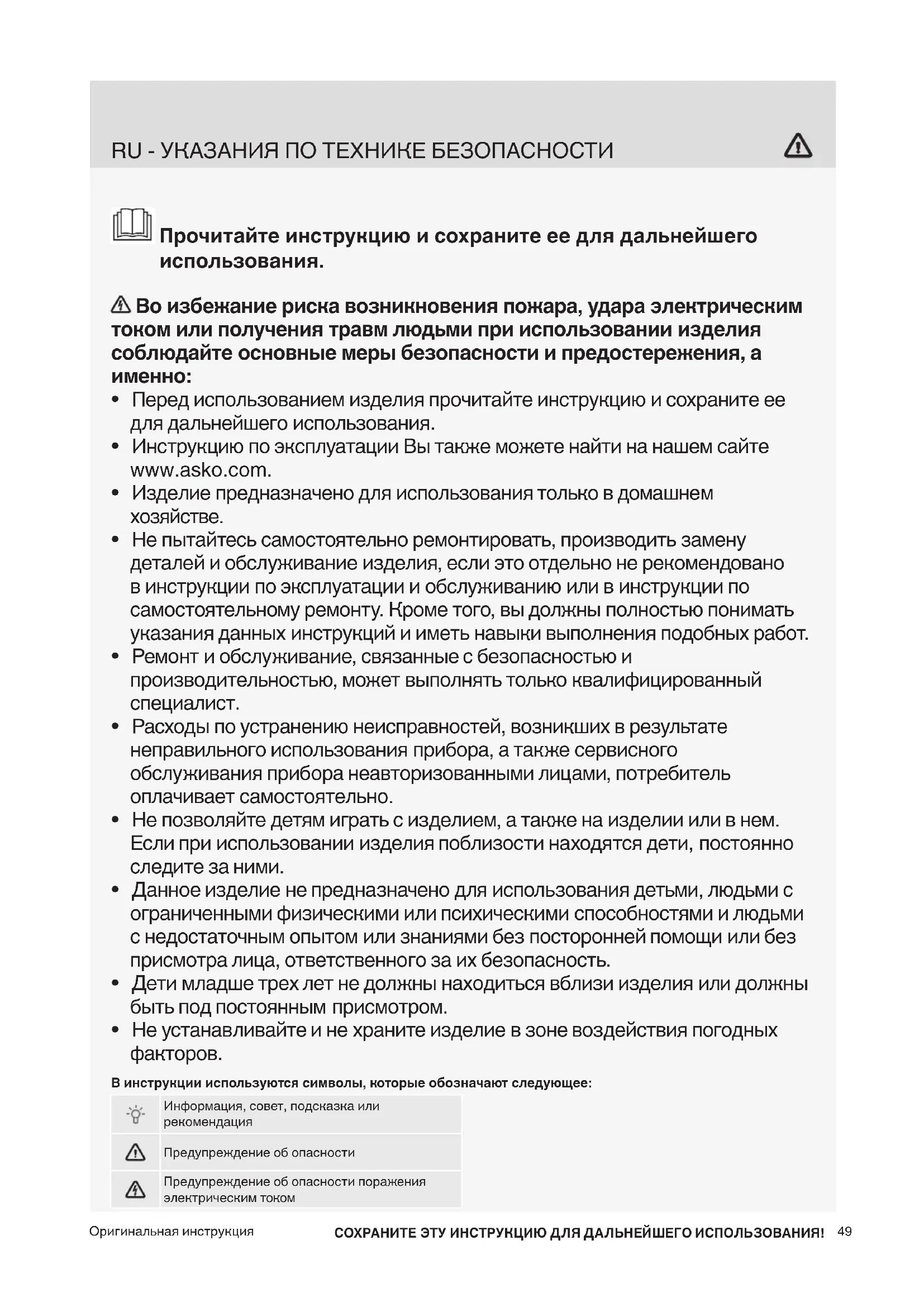 СОХРАНИТЕ ЭТУ ИНСТРУКЦИЮ ДЛЯ ДАЛЬНЕЙШЕГО ИСПОЛЬЗОВАНИЯ! В инструкции используются символы, которые обозначают следующее: Информация, совет, подсказка или рекомендация Предупреждение об опасности Предупреждение об опасности поражения электрическим током50 Используйте аксессуар только совместно со стиральными и сушильными машинами производства Asko Appliances.
