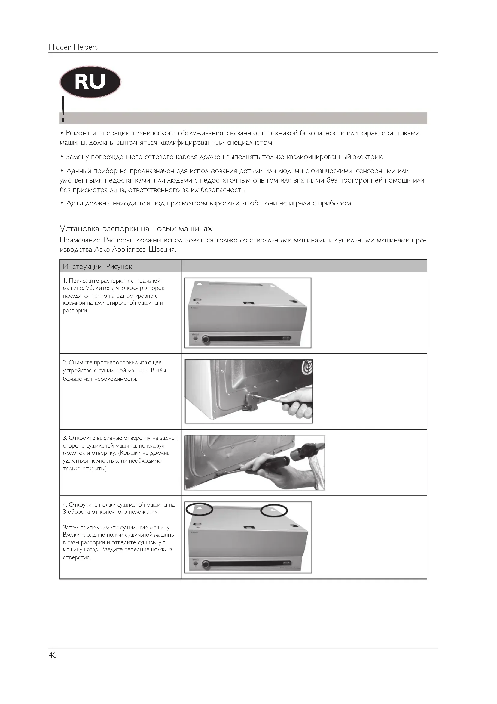 Примечание: Распорки должны использоваться только со стиральными машинами и сушильными машина- ми производства Asko Appliances, Швеция. Инструкции Рисунок