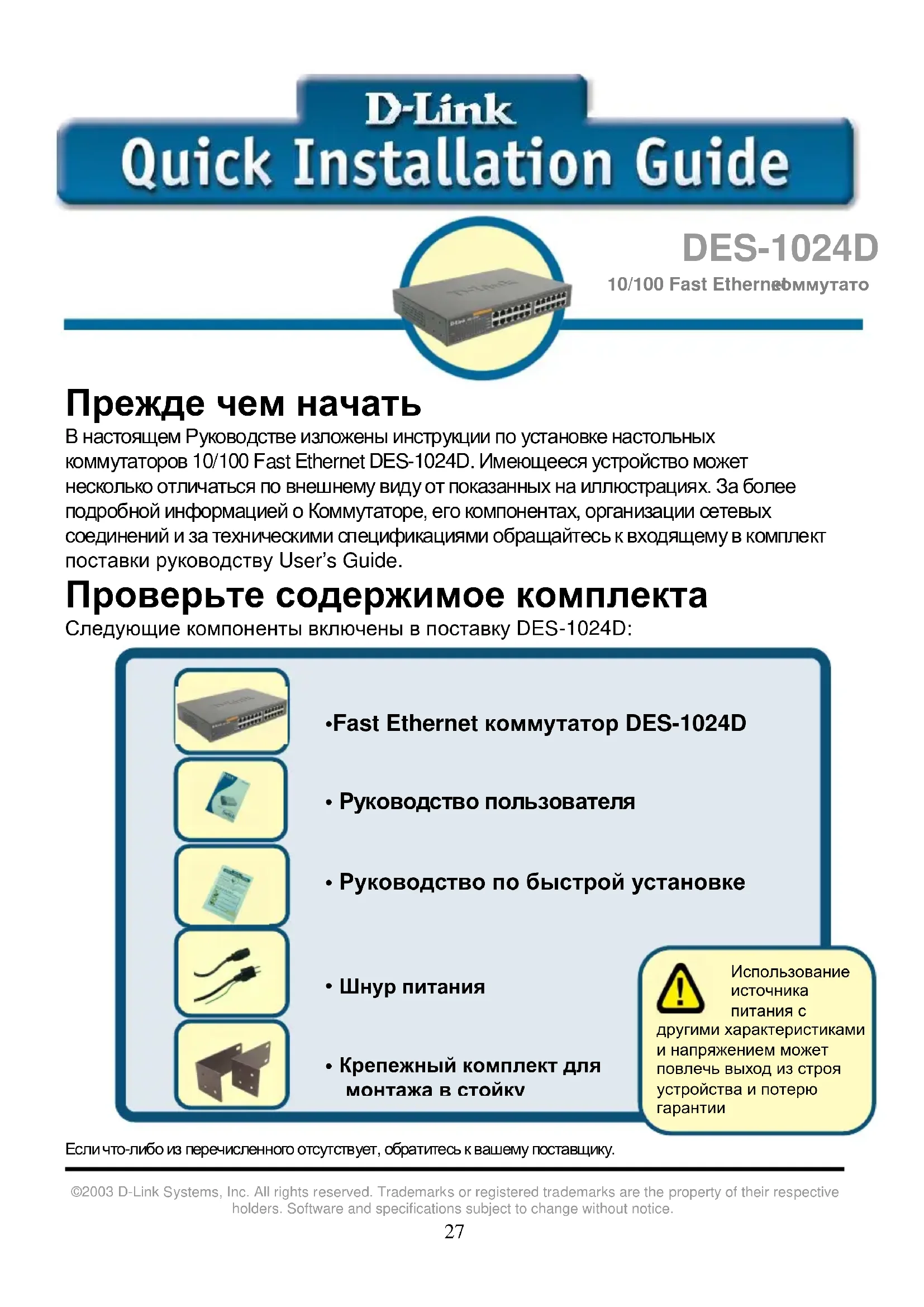 Прежде чем начать В настоящем Руководстве изложены инструкции по установке настольных коммутаторов 10/100 Fast Ethernet DES-1024D. Имеющееся устройство может несколько отличаться по внешнему виду от показанных на иллюстрациях. За более подробной информацией о Коммутаторе, его компонентах, организации сетевых соединений и за техническими спецификациями обращайтесь к входящему в комплект поставки руководству User’s Guide. Проверьте содержимое комплекта Следующие компоненты включены в поставку DES-1024D: