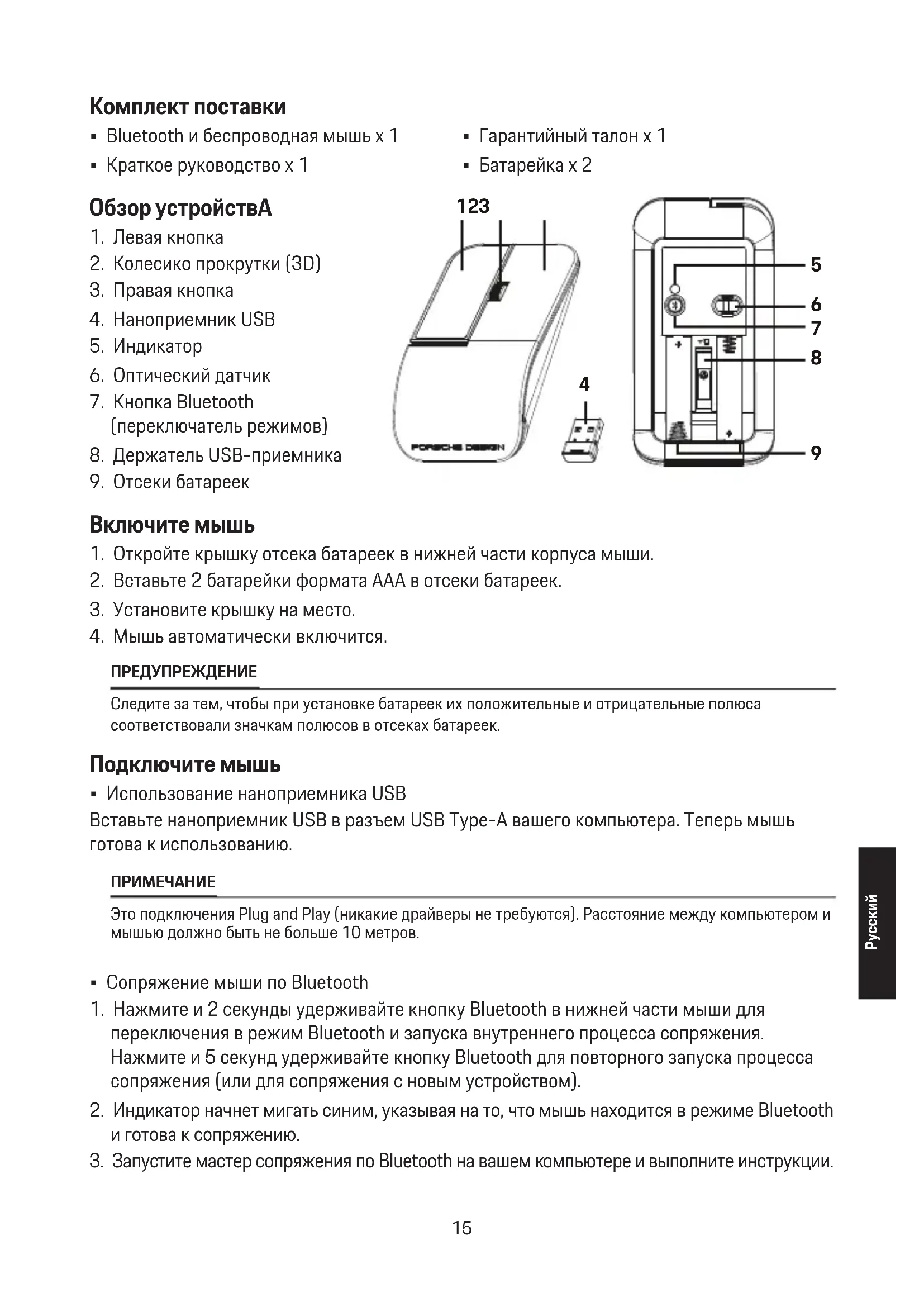 ПРЕДУПРЕЖДЕНИЕ Следите за тем, чтобы при установке батареек их положительные и отрицательные полюса соответствовали значкам полюсов в отсеках батареек. Подключите мышь