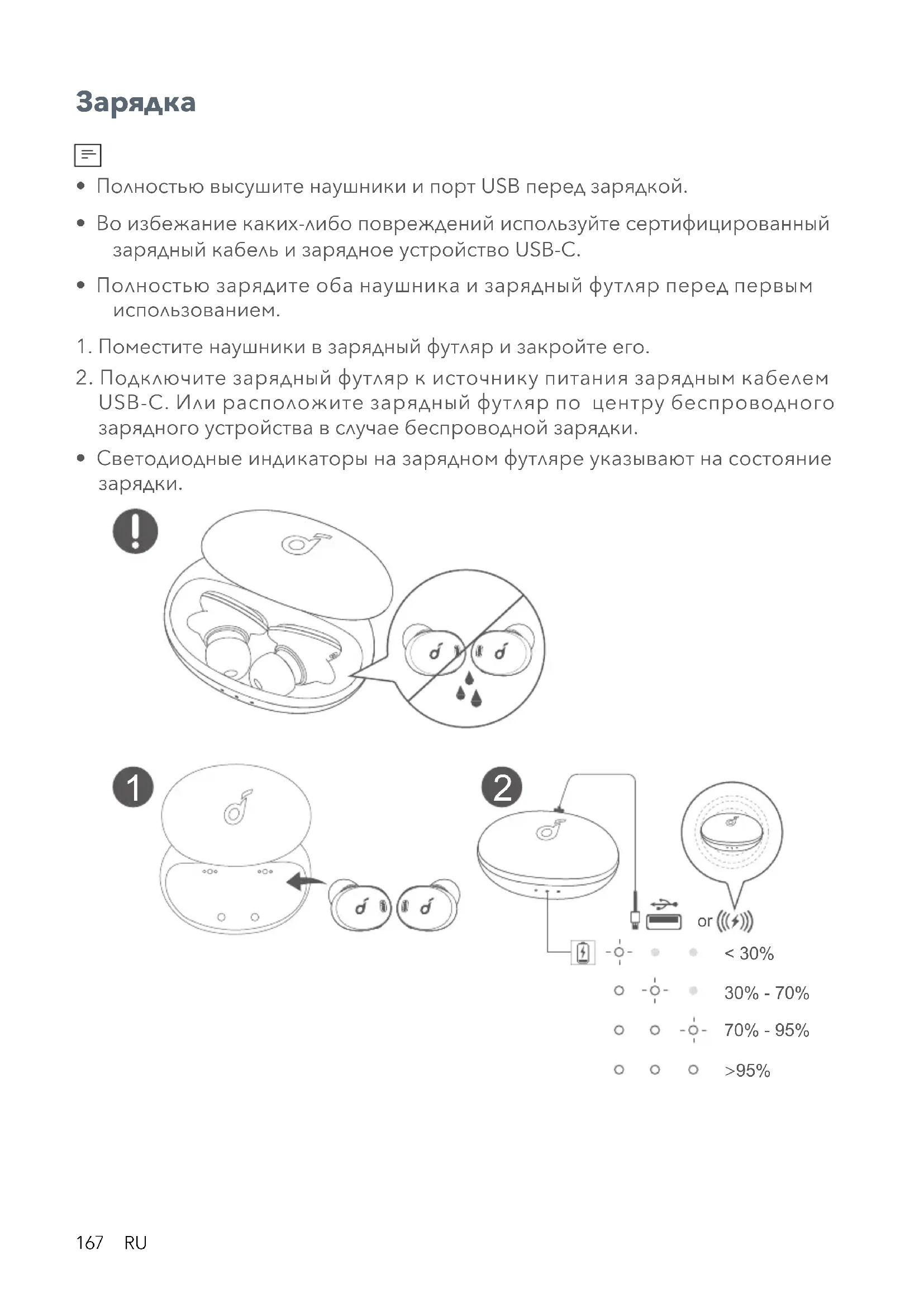 - Полностью высушите наушники и порт USB перед зарядкой.