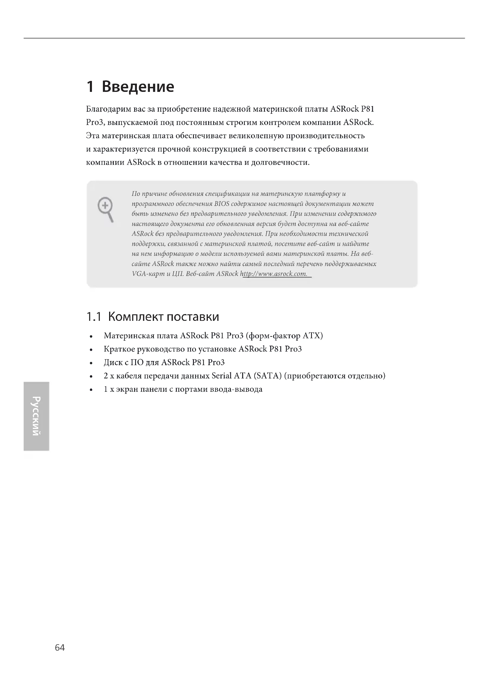 - 1 х экран панели с портами ввода-вывода По причине обновления спецификации на материнскую платформу и программного обеспечения BIOS содержимое настоящей документации может быть изменено без предварительного уведомления. При изменении содержимого настоящего документа его обновленная версия будет доступна на веб-сайте ASRock без предварительного уведомления. При необходимости технической поддержки, связанной с материнской платой, посетите веб-сайт и найдите на нем информацию о модели используемой вами материнской платы. На веб-сайте ASRock также можно найти самый последний перечень поддерживаемых VGA-карт и ЦП. Веб-сайт ASRock http://www.asrock.com.P81 Pro3