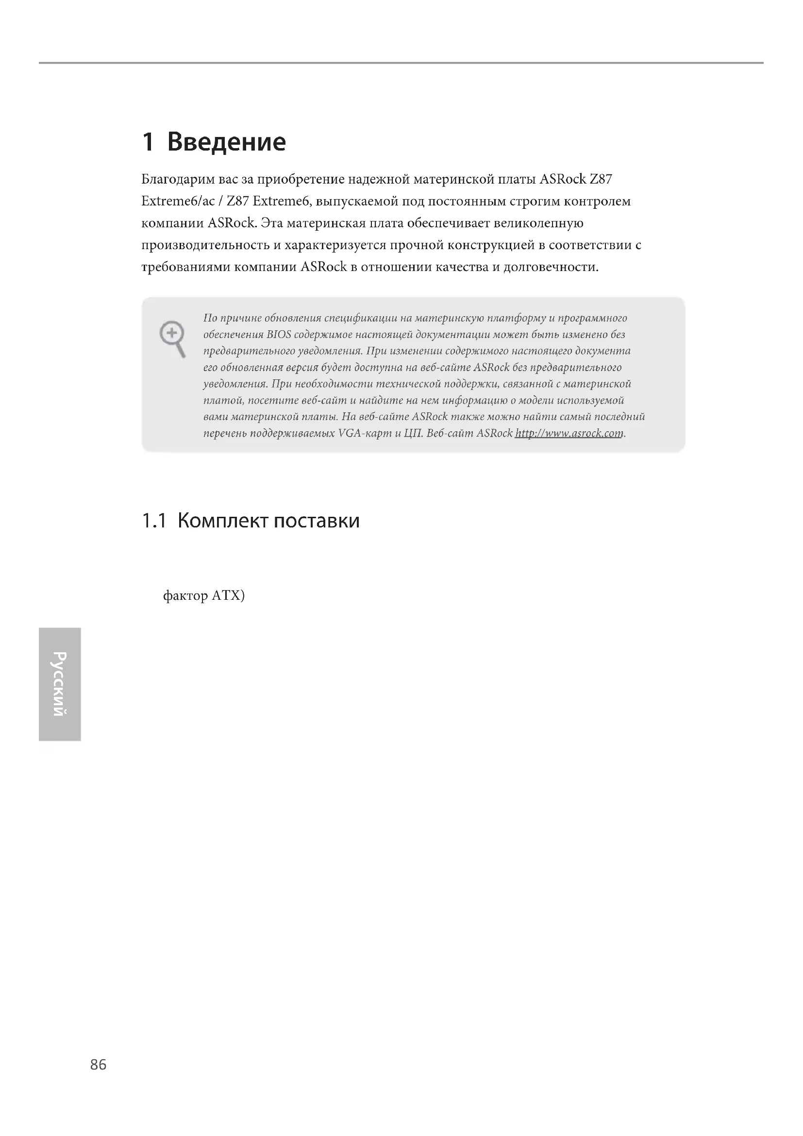 1 Введение Благодарим вас за приобретение надежной материнской платы ASRock Z87 Extreme6/ac / Z87 Extreme6, выпускаемой под постоянным строгим контролем компании ASRock. Эта материнская плата обеспечивает великолепную производительность и характеризуется прочной конструкцией в соответствии с требованиями компании ASRock в отношении качества и долговечности.